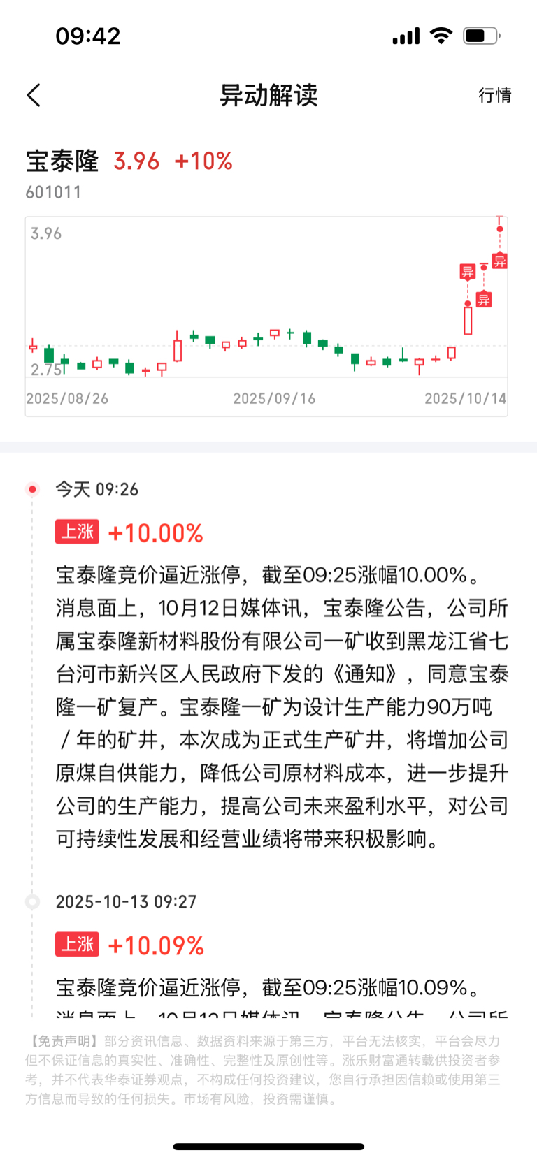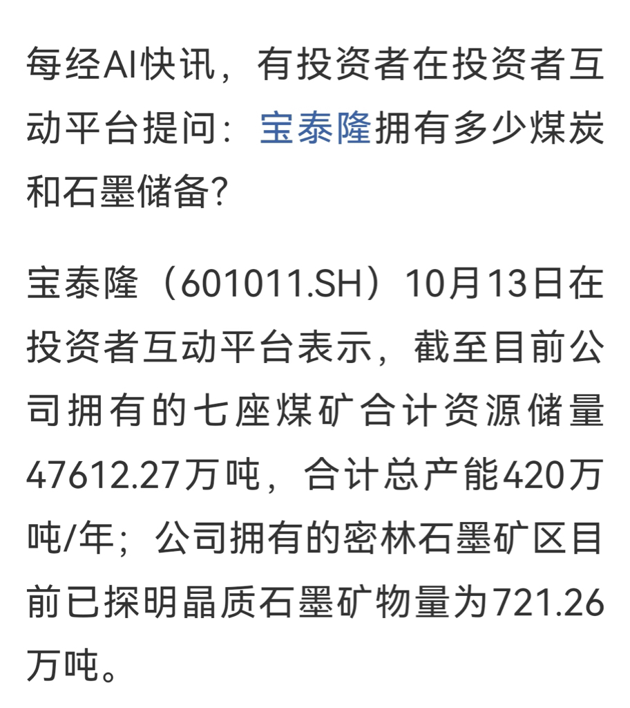 $宝泰隆(SH601011)$ 就冲着公司名字“宝泰隆”这三个字就值9个涨停板,一看就是明朝时期起的名字,历史悠久!况且公司还拥有几千亿的煤炭矿产,还有国家管控反制稀土资源“石墨烯”,还有冬天来临北方对煤炭的需求越来越多,继续看好公司的发展!