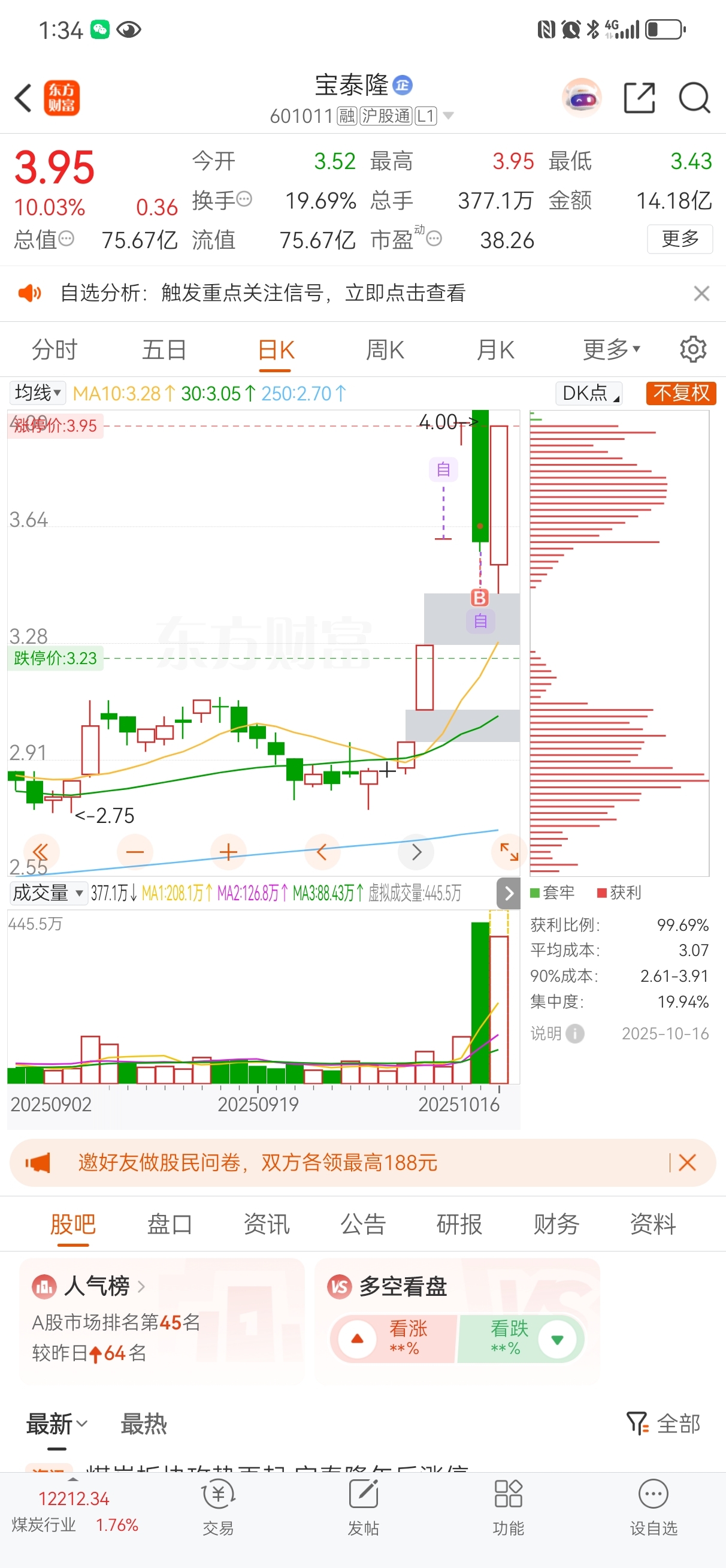 $宝泰隆(SH601011)$ 明天高开先跑一半,后续再看有板