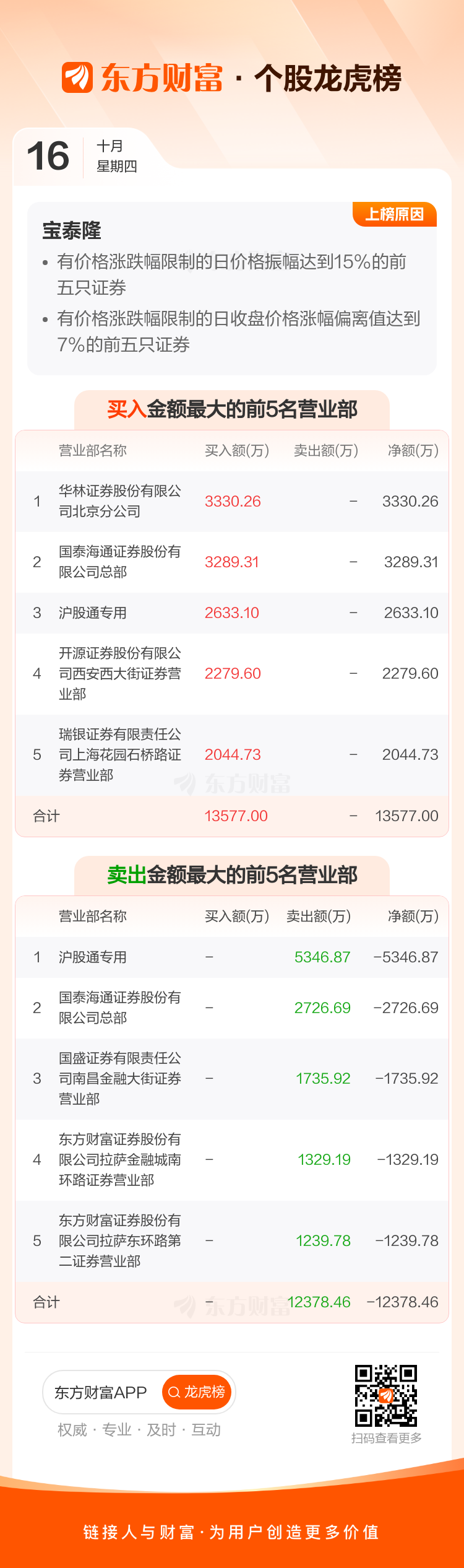 交易所2025年10月16日公布的交易公开信息显示,宝泰隆因成为有价格涨跌幅限制的日价格振幅达到15%的前五只证券、有价格涨跌幅限制的日收盘价格涨幅偏离值达到7%的前五只证券上榜。宝泰隆当日收报3.95元,涨跌幅10.03%,偏离值15.16%,换手率20.19%,成交额14.56亿。