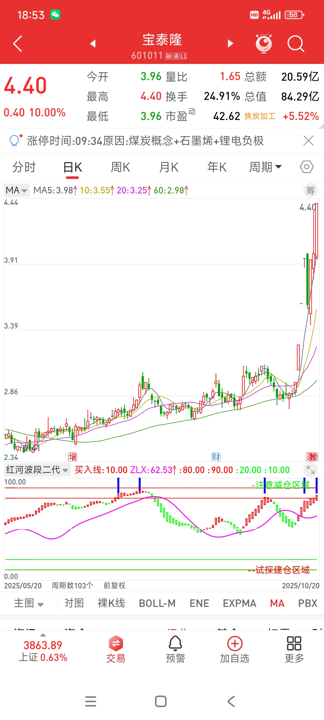 $宝泰隆(SH601011)$ 上周冲高回落很多人都怕了,但我觉得,红柱不停,上涨不止,红柱拉长,加速不止,继续冲