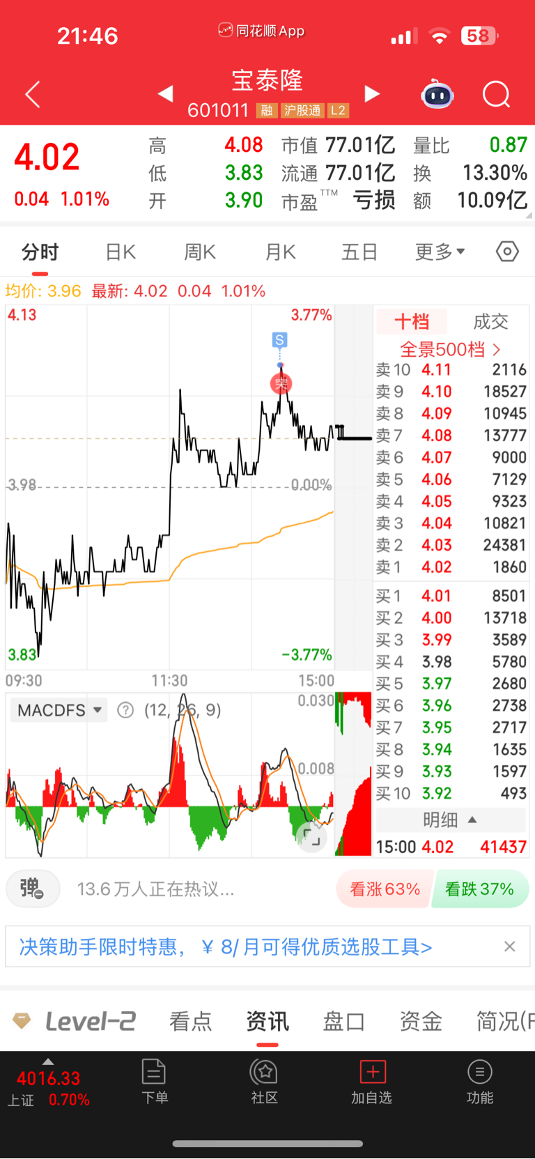 $宝泰隆(SH601011)$ 挂单睡个午觉,没想到t的这么精准