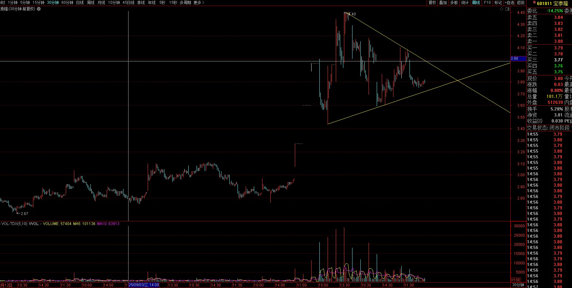 宝泰隆,前面爆量突破之后,已经在上面整理了几天了,30分钟分时线呈收敛三角形调整