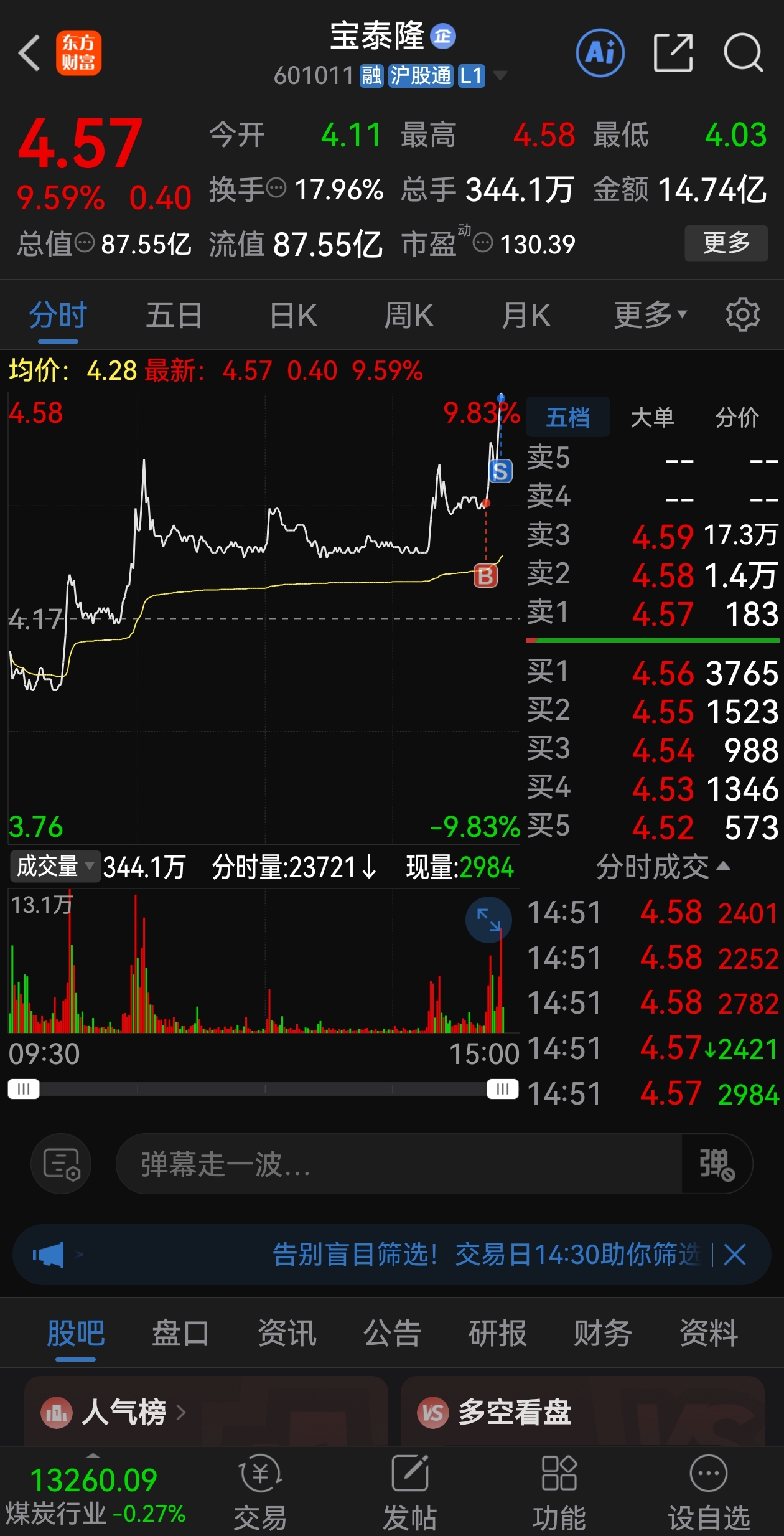 $宝泰隆(SH601011)$ 不肯抛,又想吃点肉,尾盘不太敢加仓,只能做一下T。