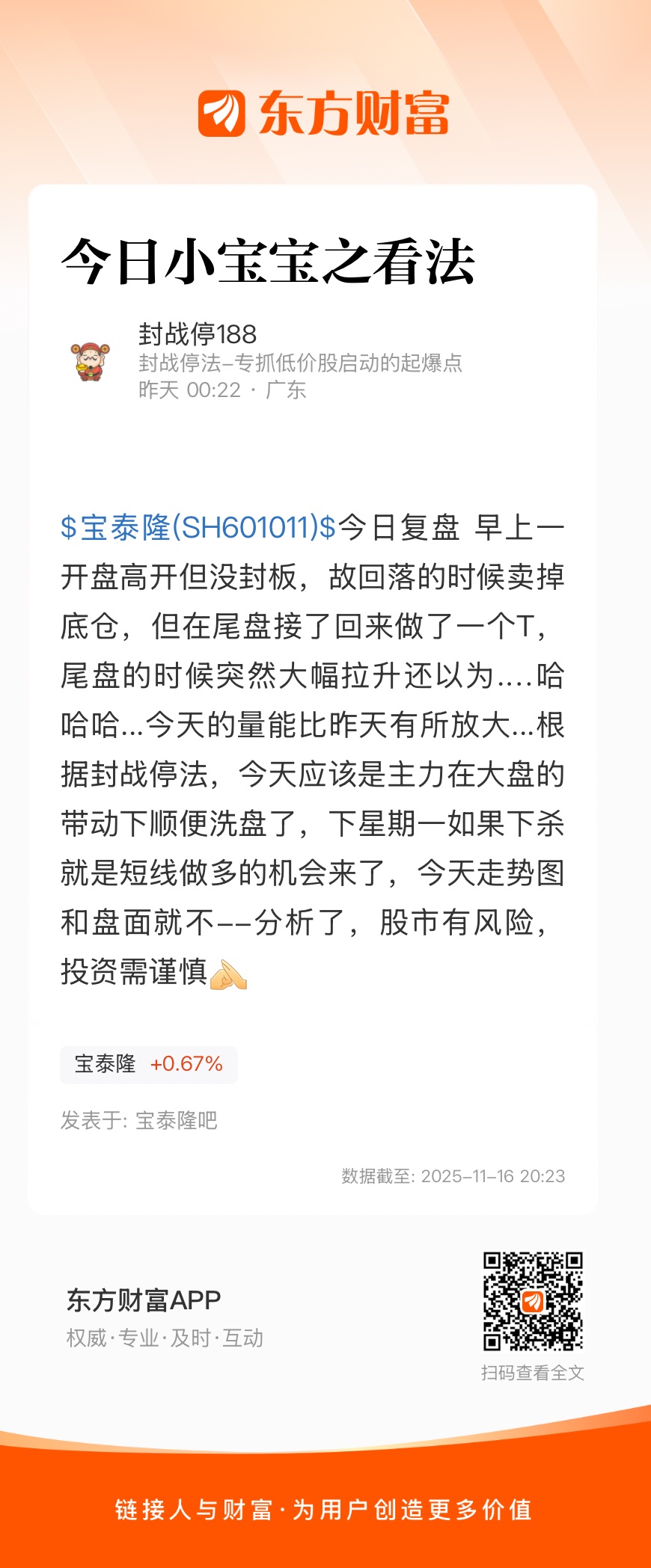 $宝泰隆(SH601011)$今日复盘 早上一开盘高开但没封板,故回落的时候卖掉底仓,但在尾盘接了回来做了一个T,尾盘的时候突然大幅拉升还以为.…哈哈哈...今天的量能比昨天有所放大...根据封战停法,今天应该是主力在大盘的带动下顺便洗盘了,下星期一如果下杀就是短线做多的机会来了,今天走势图和盘面就不--分析了,股市有风险,投资需谨慎