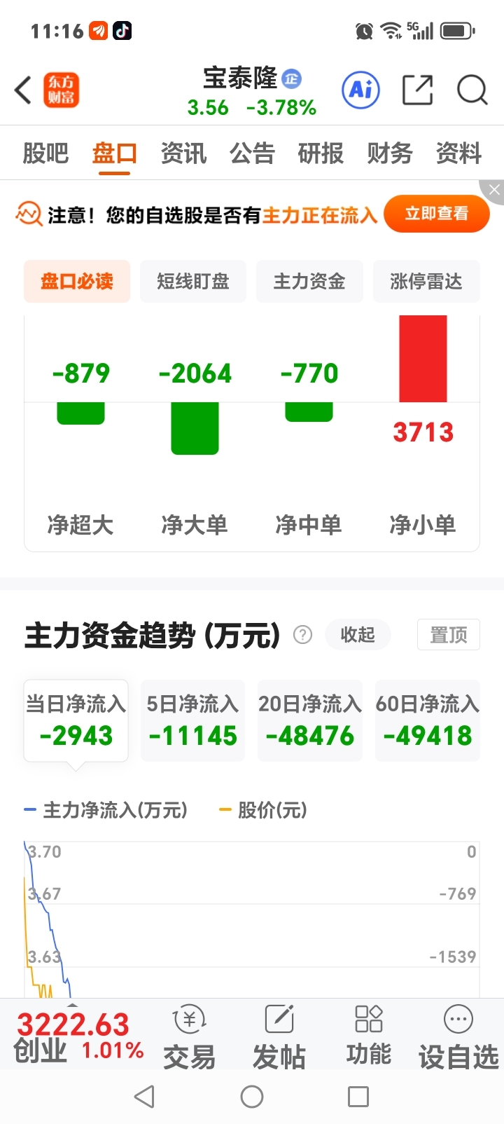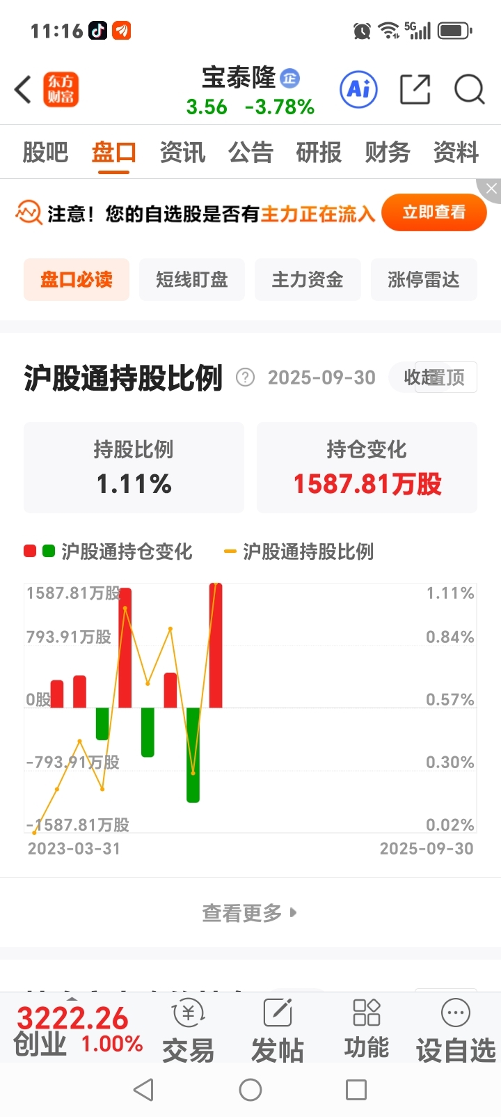 $宝泰隆(SH601011)$ 哈哈该股业绩不亏,股价却比亏损的同板块股票的股价低得多,这说明什么呢?只能说明主力资金在偷偷摸摸的买进,而不断的以小单的形式偷偷摸摸的流入,欺骗可怜的孩子们割肉砸盘的卖出,它却在地位买进持有,寻求机会拉升。看看深股通再不断的买进着,我们要幸福快乐,就要趁低果断买进持有,必有后福。