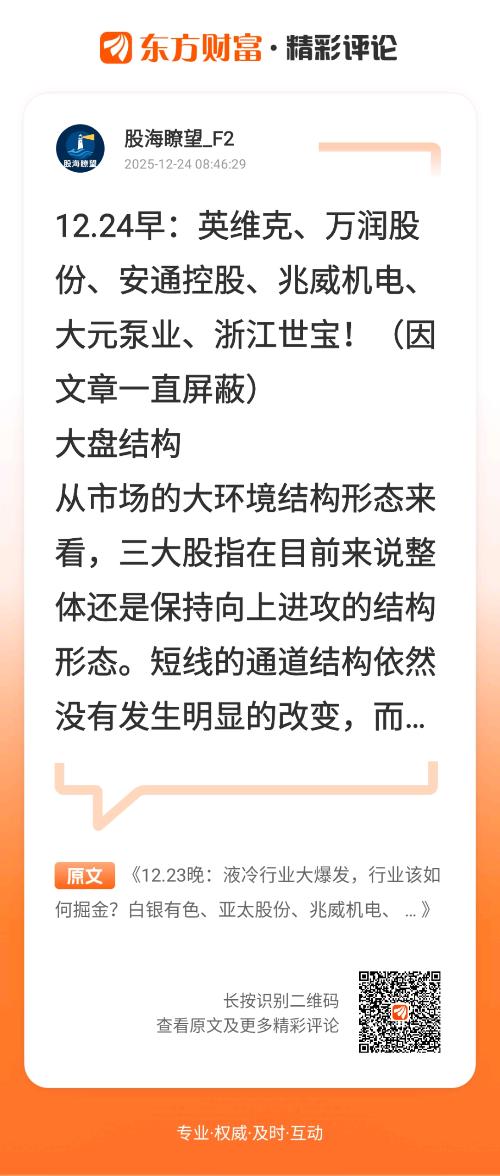 $宝泰隆(SH601011)$$合肥城建(SZ002208)$$万向钱潮(SZ000559)$//@股海瞭望_F2 :12.24早:英维克、万润股份、安通控股、兆威机电、大元泵业、浙江世宝!(因文章一直屏蔽)大盘结构从市场的大环境结构形态来看,三大股指在目前来说整体还是保持向上进攻的结构形态。短线的通道结构依然没有发生明显的改变,而且守住了3900点以后,下一个关口则是冲击3950点位,目前来说成交量逐步回暖,市场的整体短线情绪也在逐步攀升过程当中,所以会有持续上升的动能。股指阶段来说,没有太大的风险因素,而最为关键的则是现在的无人驾驶有望接过商业航天上涨的大旗,成为新的市场主体,所以在这个领域当中非常值得期待。