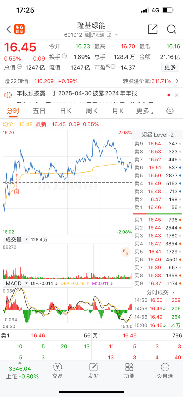 $隆基绿能(SH601012)$ 今天的走势,一会儿惊喜,一会儿忧愁。