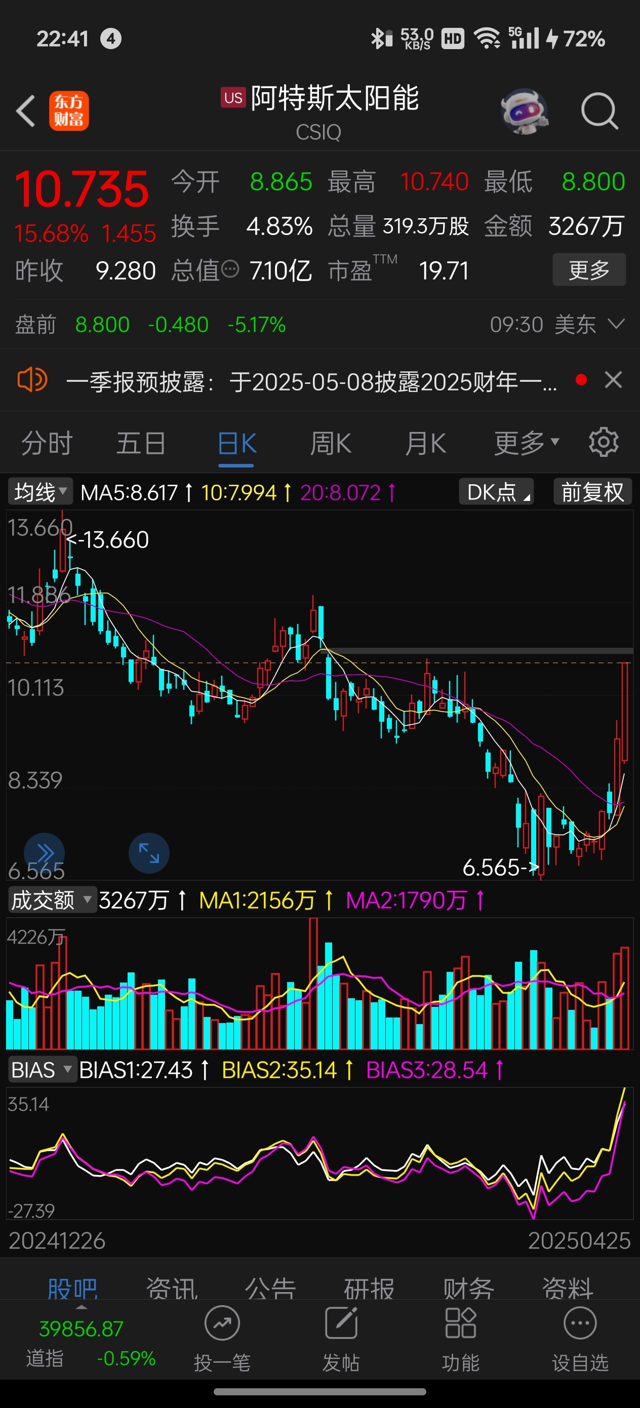 我去,神经病了,两天30%,阿特斯周一咋玩?