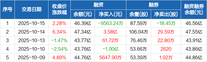 融资方面,当日融资买入8.37亿元,融资偿还9.33亿元,融资净偿还9563.24万元。融券方面,融券卖出8.62万股,融券偿还27.07万股,融券余量87.59万股,融券余额1727.35万元。融资融券余额合计46.56亿元。