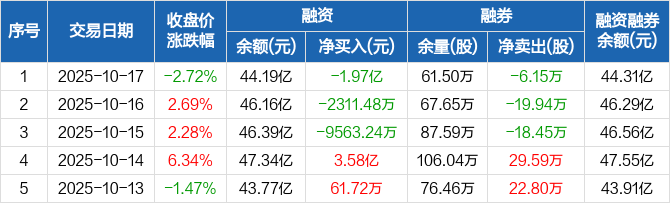 隆基绿能融资融券信息显示,2025年10月17日融资净偿还1.97亿元;融资余额44.19亿元,较前一日下降4.26%。