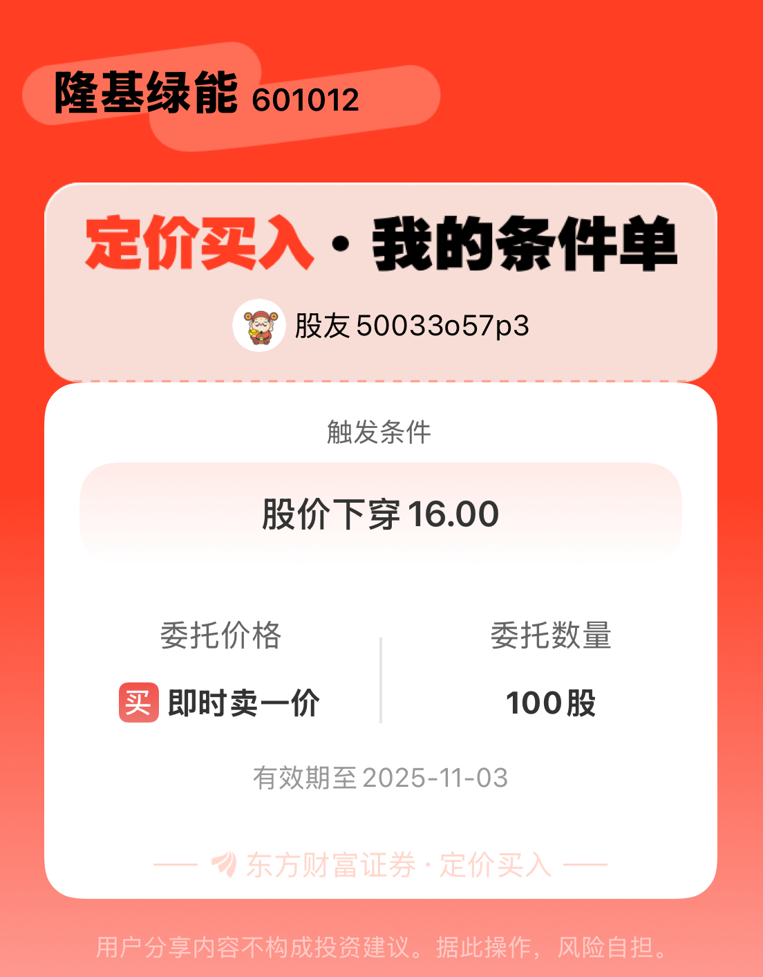 #条件单交流# #定价买入晒单# 一位股神设置了一个定价买入条件单,接下来就是见证奇迹的时刻~$隆基绿能(SH601012)$