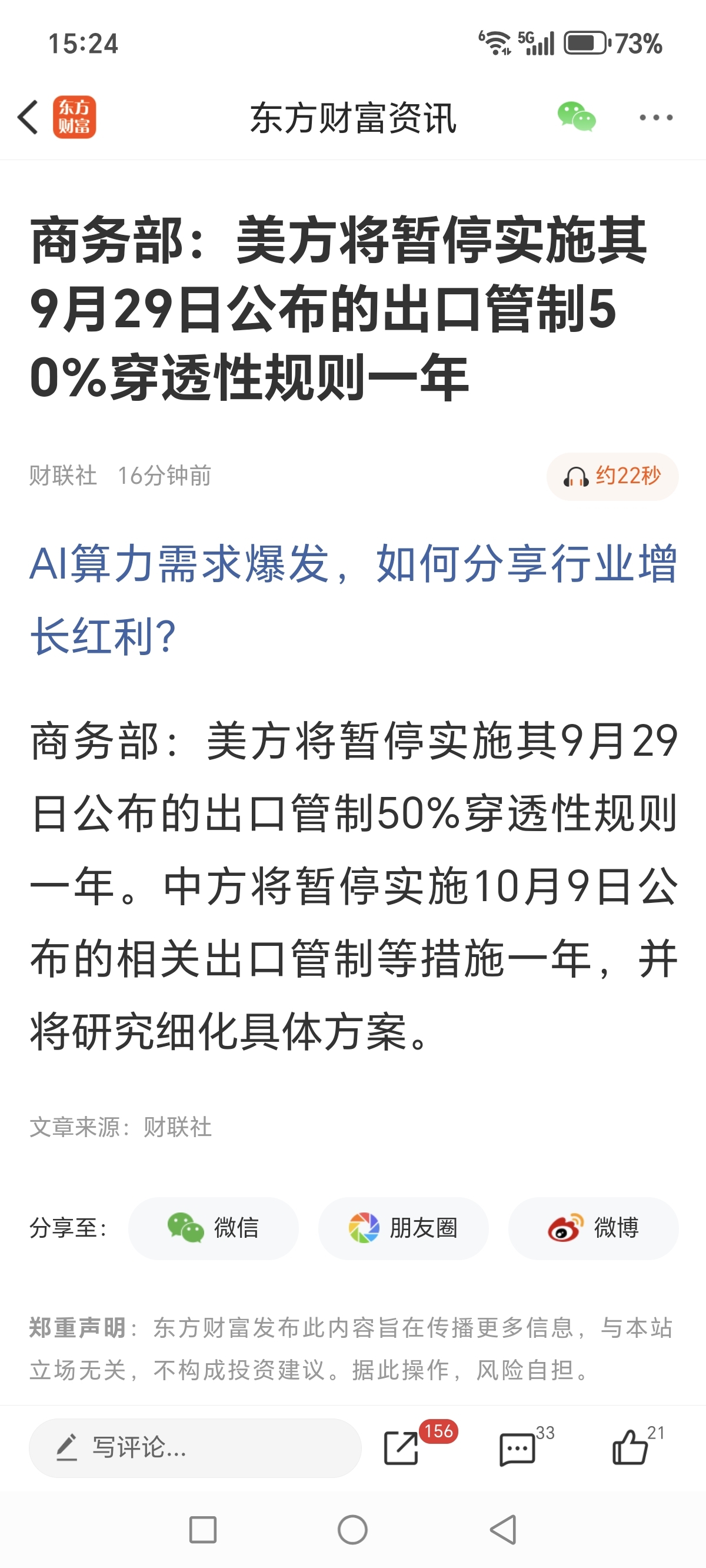 $隆基绿能(SH601012)$ $北方稀土(SH600111)$ $上证指数(SH000001)$ 重大利好!商务部:美方将暂停实施其9月29日公布的出口管制50%穿透性规则一年