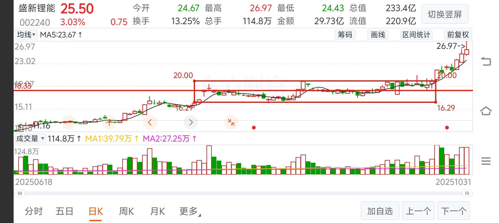 此图为盛新锂能站上牛熊分界线后上下调整。调整结束,已经有40%的涨幅