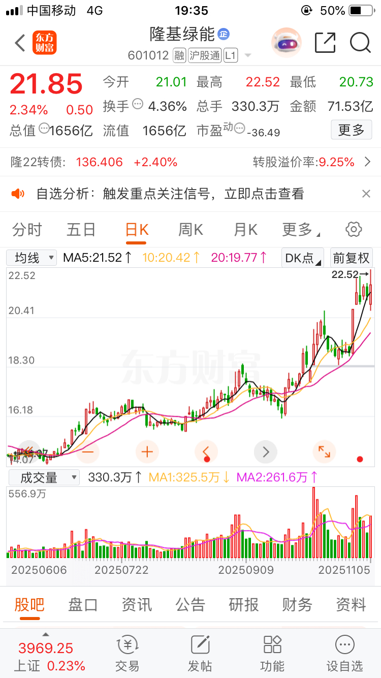$隆基绿能(SH601012)$ 隆基绿能趋势太漂亮了,是不是庄家故意做给散户看的。之前我就说过22.50元庄家会主动止盈,果然,今天冲到22.52元就回落了,更耐人寻味的是,今天尾盘竞价成交11万股211万元,成交打折11.9%为19.25元。为何这般急?已经搞不懂了。只能说业绩巨亏,终究是个雷。