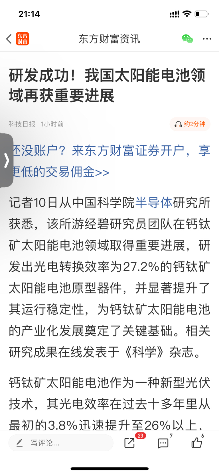 钙钛矿太阳能电池取得突破性进展,技术领先全球。