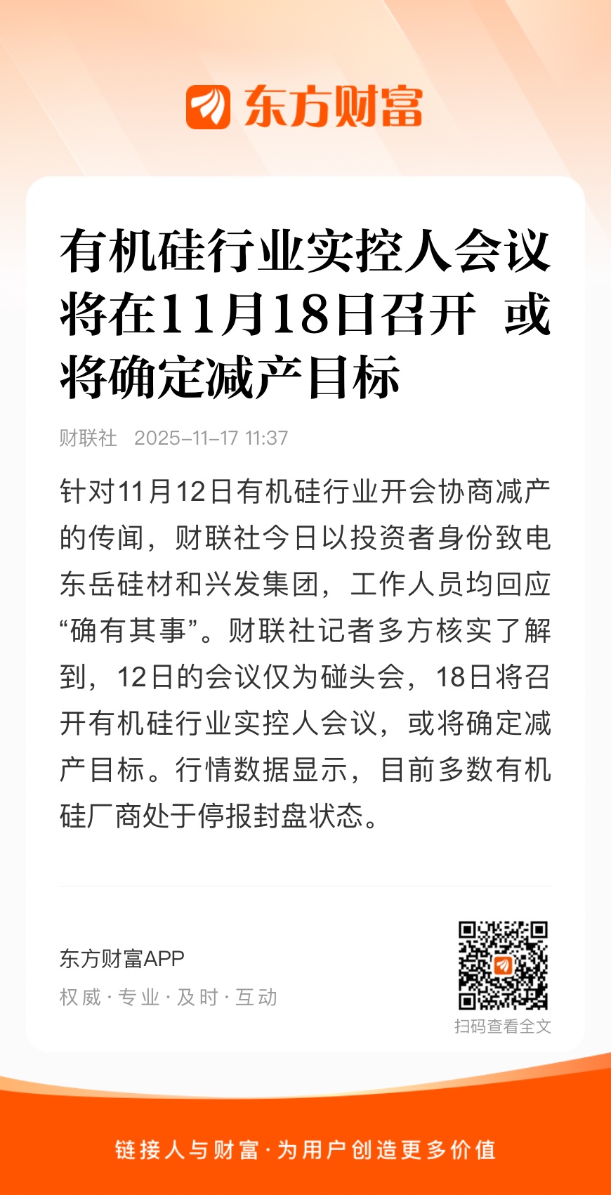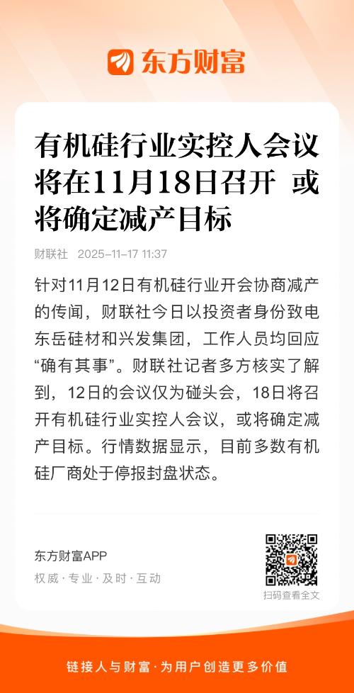 针对11月12日有机硅行业开会协商减产的传闻,财联社今日以投资者身份致电东岳硅材和兴发集团,工作人员均回应“确有其事”。财联社记者多方核实了解到,12日的会议仅为碰头会,18日将召开有机硅行业实控人会议,或将确定减产目标。行情数据显示,目前多数有机硅厂商处于停报封盘状态。