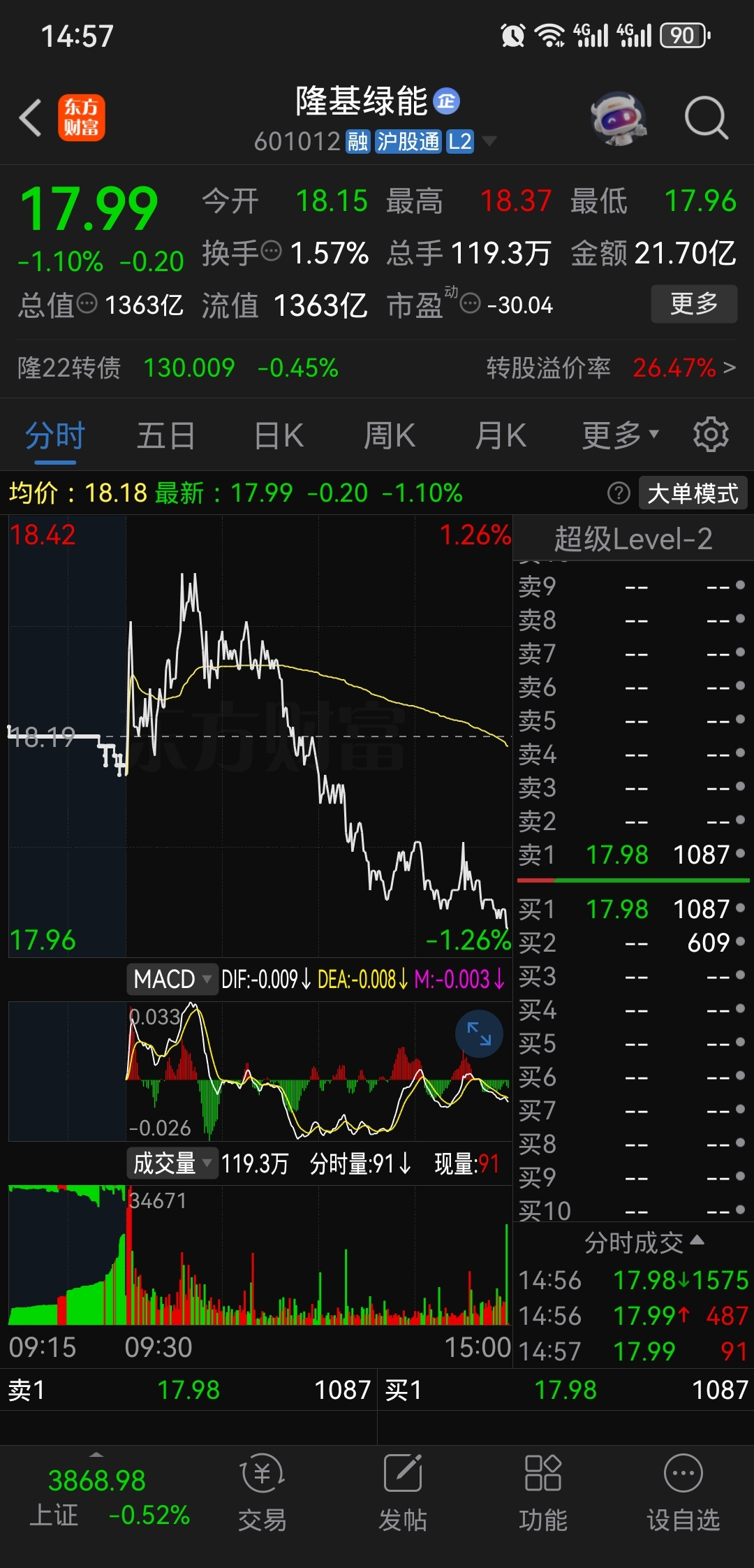 隆基这票是真臭,期货大涨,通威反弹,板块稳着时,隆基在杀跌!股性很差就是里面的资
