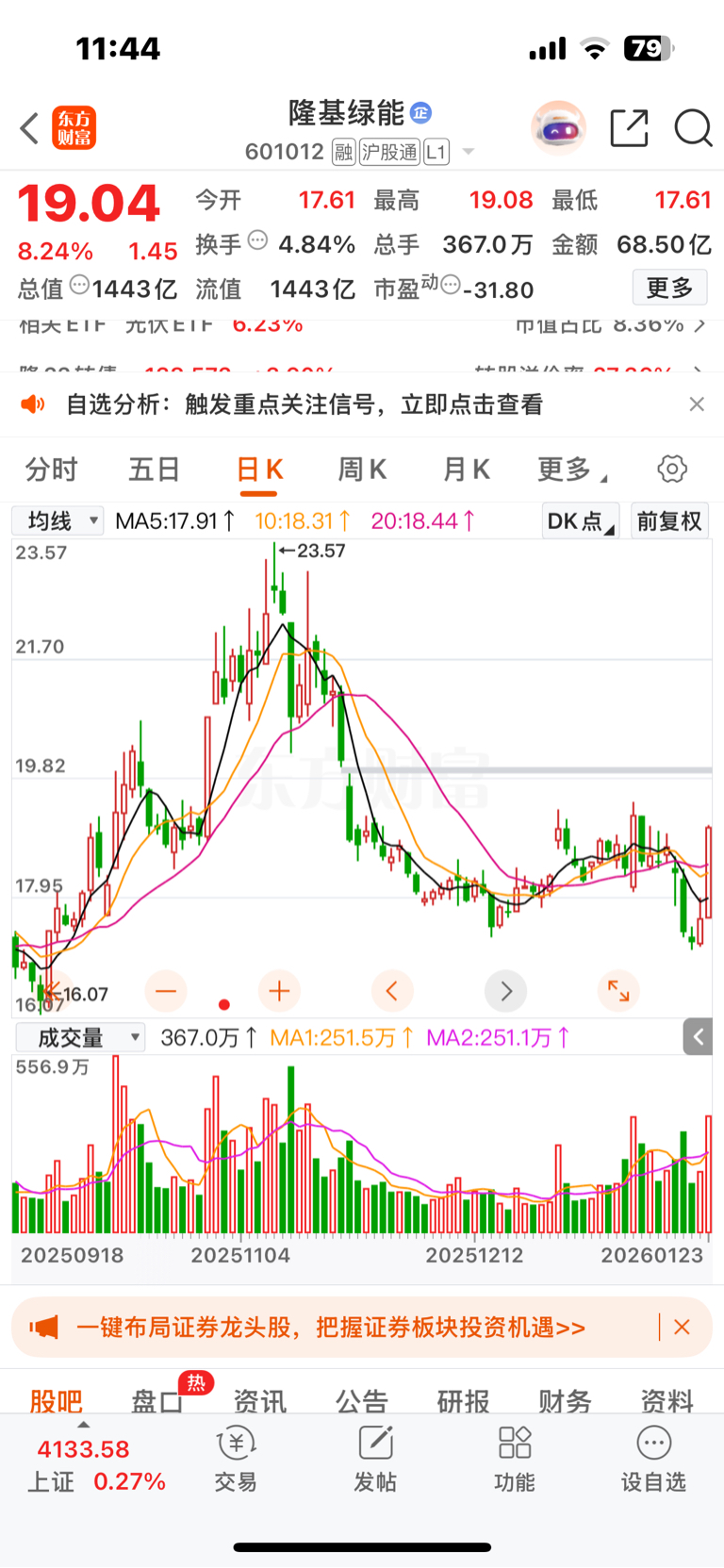 $隆基绿能(SH601012)$ 在关注着,今天确实有资金抄底了隆基绿能,资金进得那么急,却又没快速封板,都涨了8 %了,还在等什么呢?等散户上车坐满?前段时间那根中阳4%还没解套呢,至于说等被套的散户卖出,这个不成立的,前几天挖坑向下砸破防了,哪还有散户,如果有散户,今天也不会大涨8 %,所以今天的大涨必须封板,否则就是等新散上车,共同富裕。让你们先富起来,我在后面择机捡点漏。