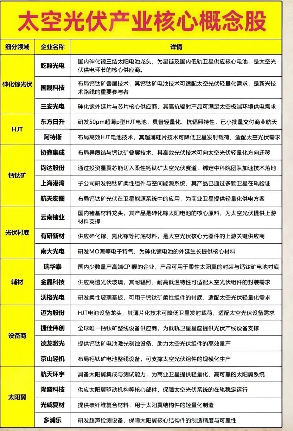 2. 技术适配潜力股:东方日升(70μm HJT已交付数万片)、天合光能(多路线布局),受益低轨卫星轻量化;