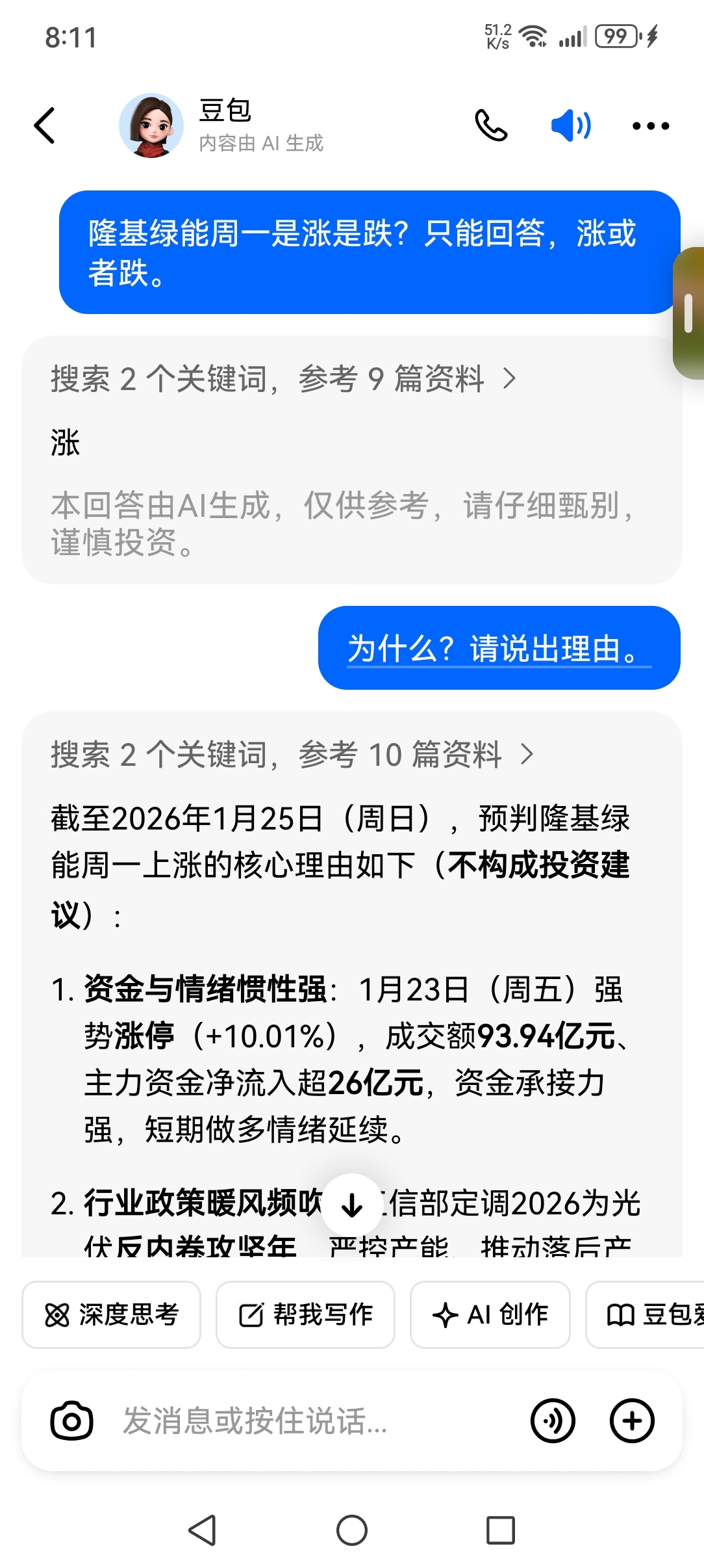 $隆基绿能(SH601012)$ 昨天我就是相信了豆包的话,所以才买进的。