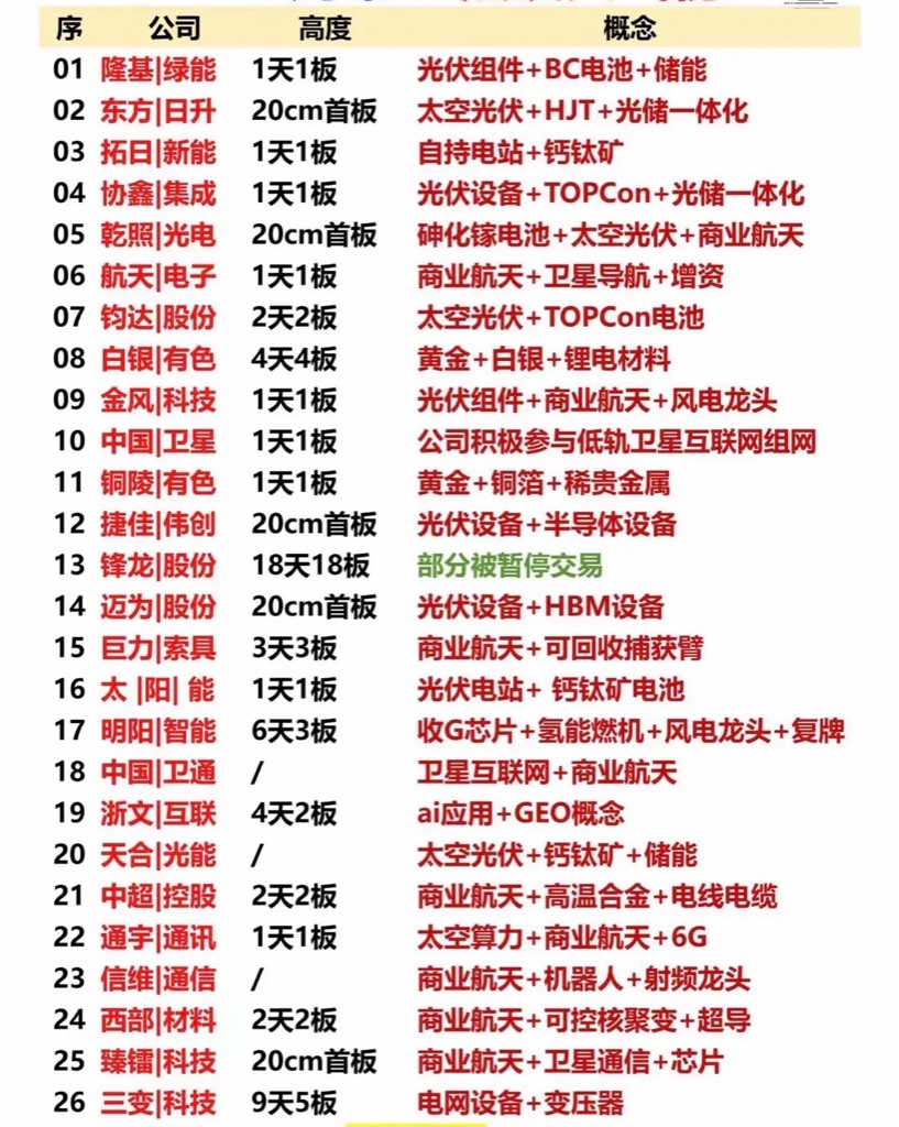 "光伏与商业航天板块热度攀升,钧达、隆基领涨,钙钛矿与储能概念受捧,投资需理性。"光伏、商业航天、储能概念股活跃,多股涨停,市场热度高。投资需谨慎,风险自担。$隆基绿能(SH601012)$ $东方日升(SZ300118)$ $利欧股份(SZ002131)$