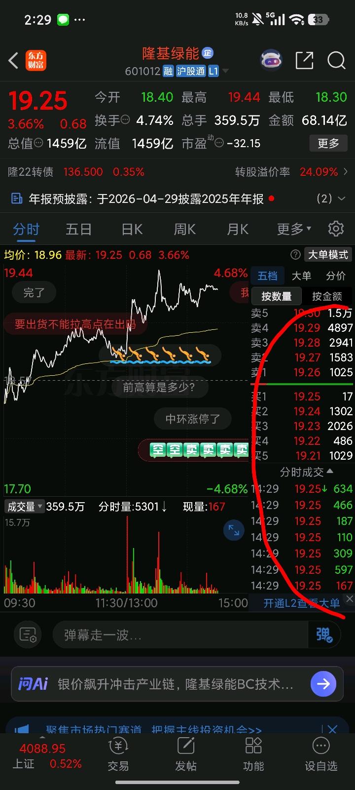 $隆基绿能(SH601012)$ 巨量压单,刚才有两个四千多手都没把股价提高,基本没戏,认作是出货