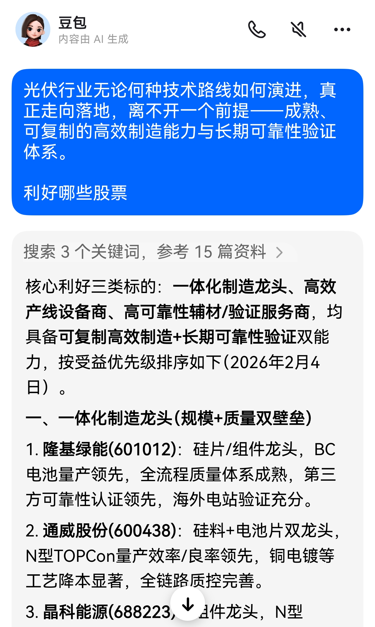 $隆基绿能(SH601012)$ 中国光伏行业协会执行秘书长刘译阳2月4日对界面新闻等媒体表示,无论何种技术路线如何演进,真正走向落地,离不开一个前提——成熟、可复制的高效制造能力与长期可靠性验证体系。