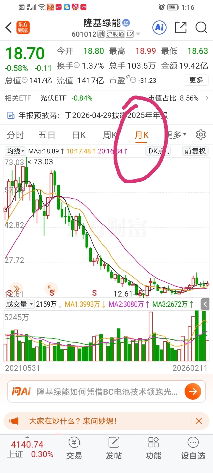 $隆基绿能(SH601012)$ 18.88进来,想赌个洗盘尾声,靠,细看才发现跌了几年了,起来空间也不大。