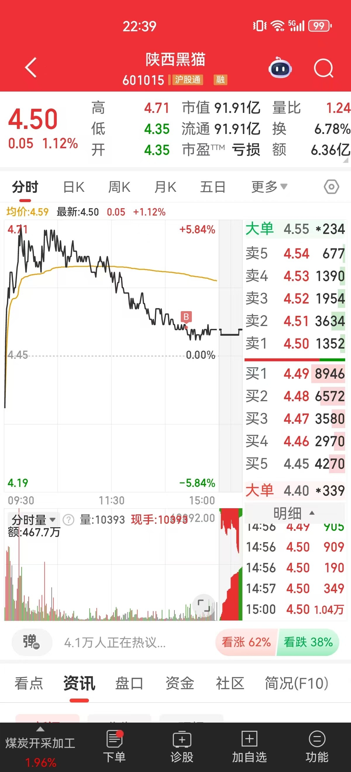 下午买入601015陕西黑猫,焦炭+天然气+股权转让,连续三天上攻,资金进入积极