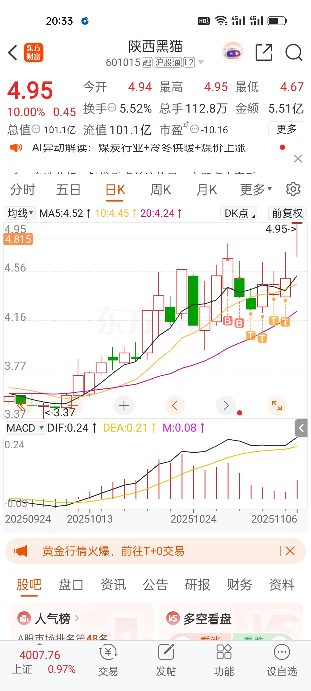 $陕西黑猫(SH601015)$ 出掉了大半,你今天居然涨停了