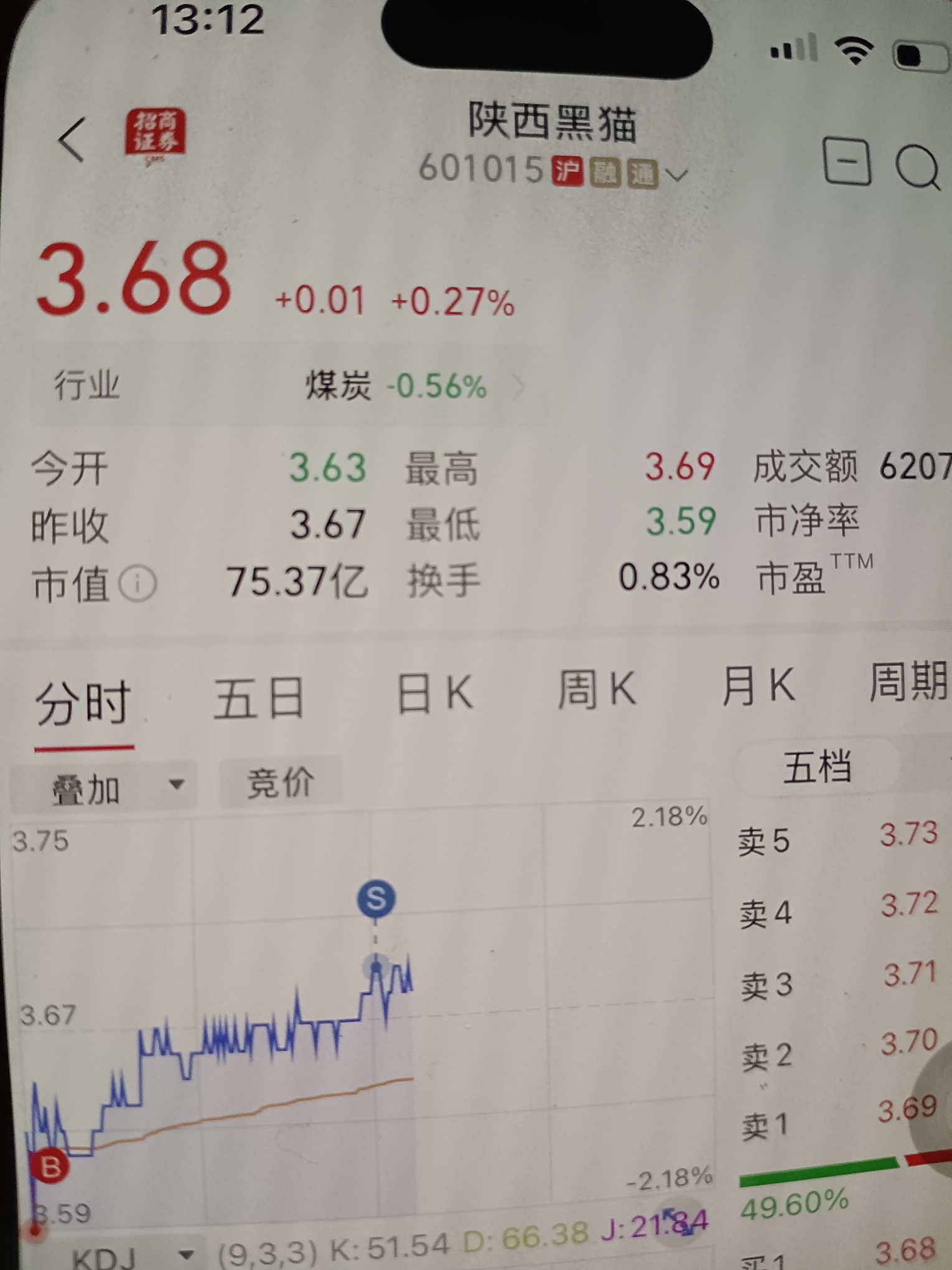 $陕西黑猫(SH601015)$ 开盘3.59买,现在3.69卖了。赚一毛钱就够了。每天赚几百块就收工。