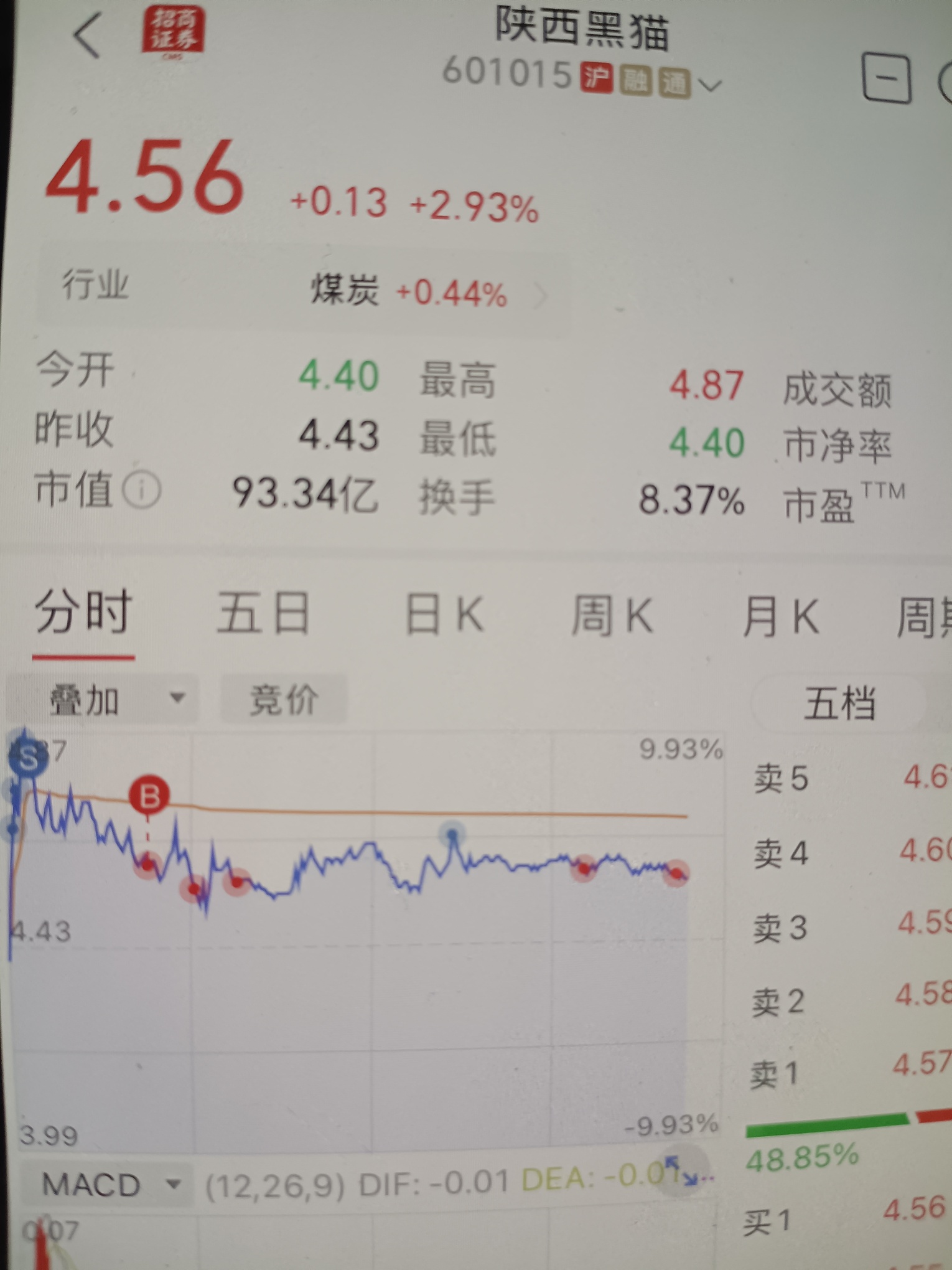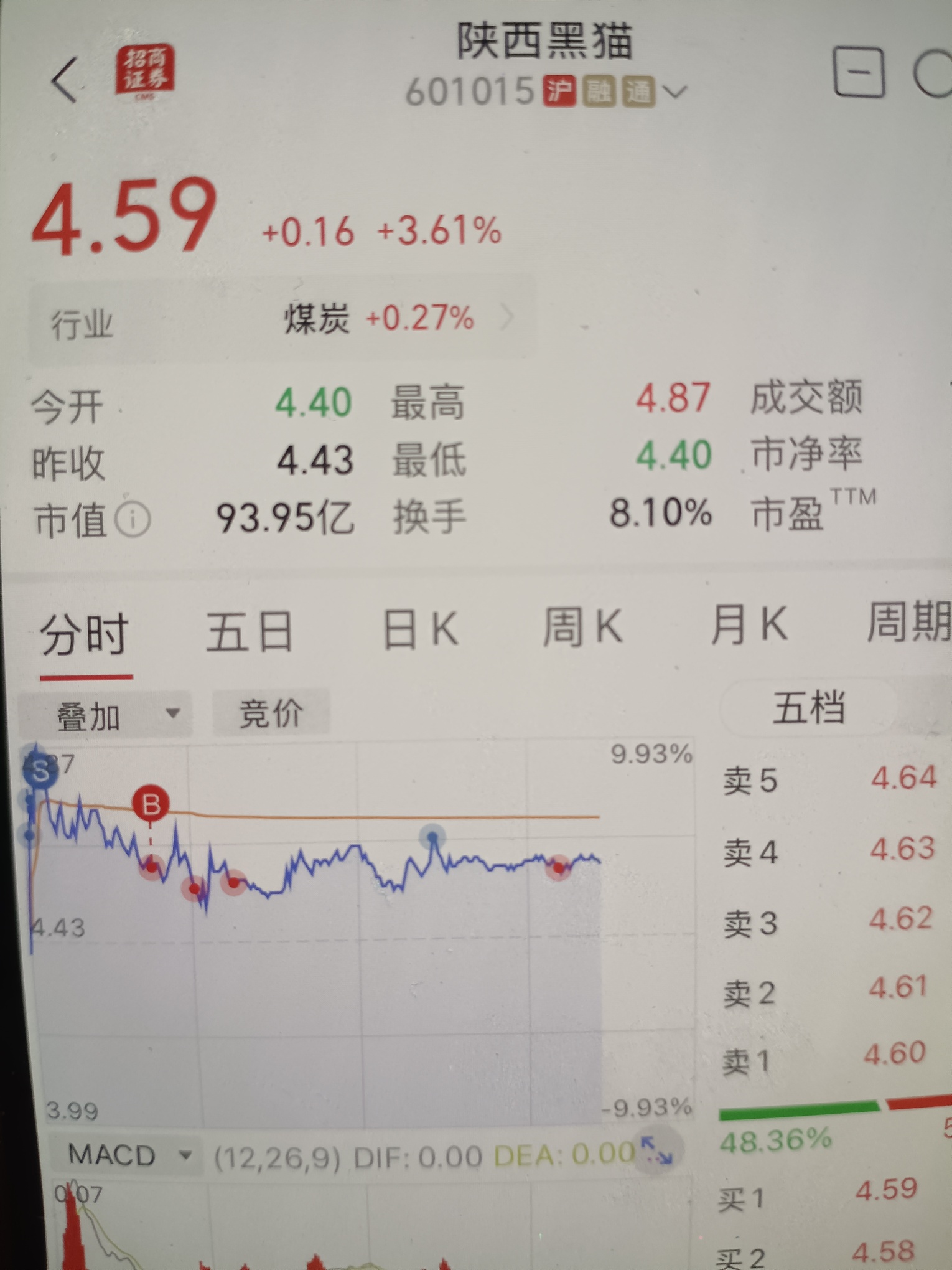 $陕西黑猫(SH601015)$ 今天成交量突破昨天,早上打板的有两个亿。预示着接下来4.7附近震荡整理。我是开始高抛低吸了。今天本来再放手做t,结果4.51买的时候券商死活打不开,最后认命了,顺其自然了。