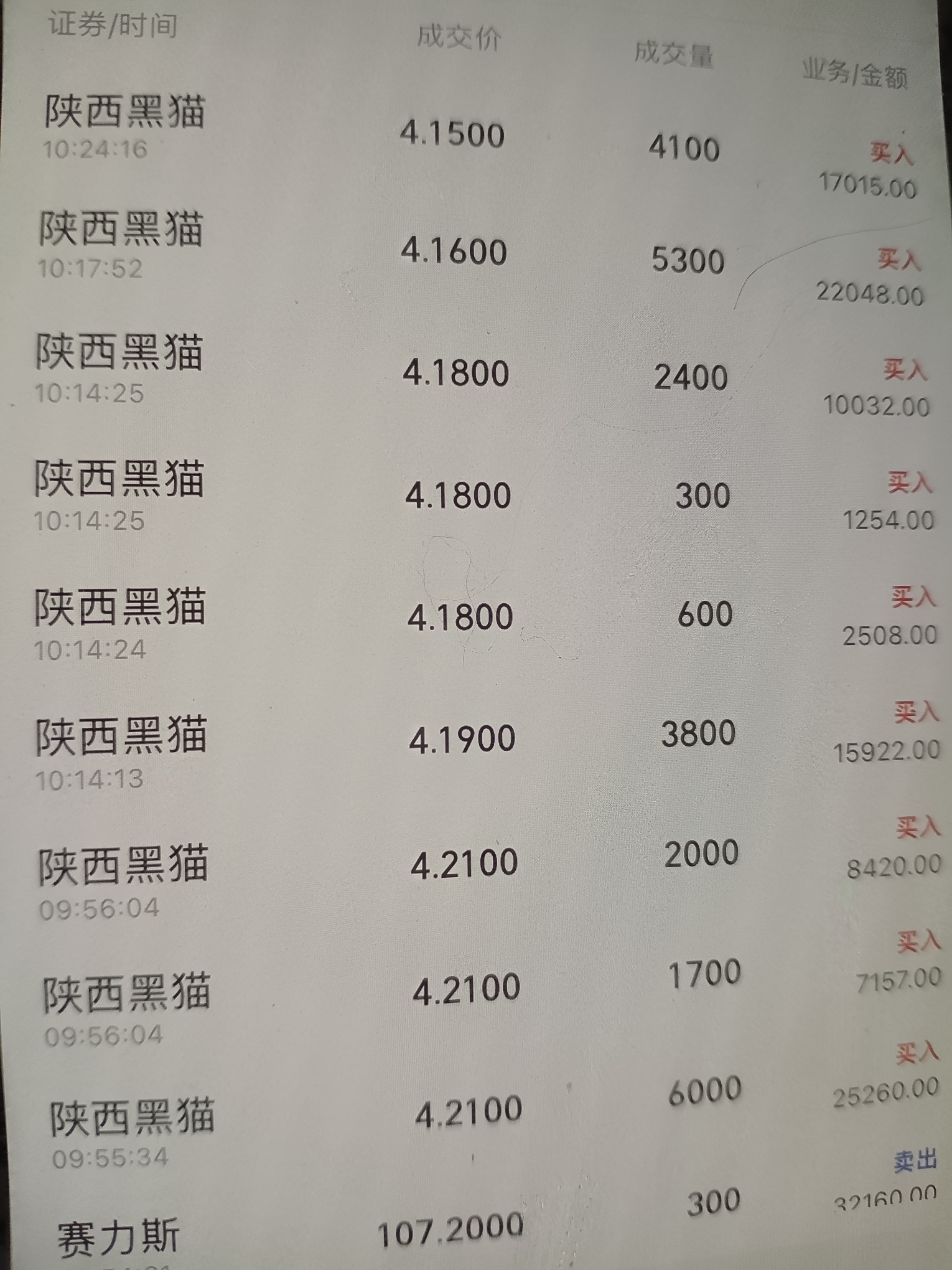 $陕西黑猫(SH601015)$ 感谢主力让我低位买回来陕西黑猫。今天调仓换股,卖赛力斯卖平安银行卖东方财富。全部买陕西黑猫。