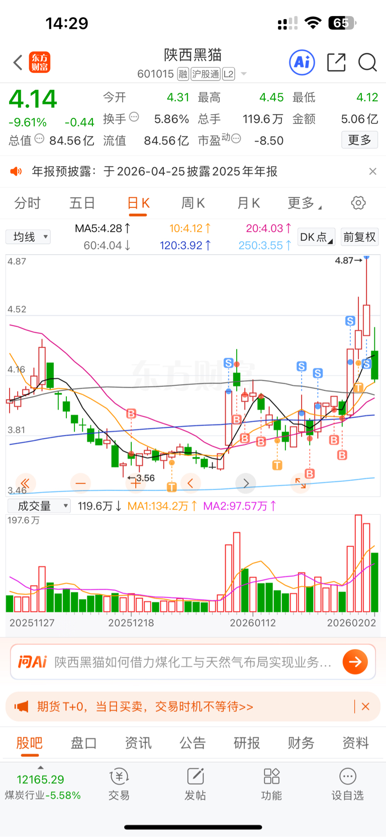 $陕西黑猫(SH601015)$ 亏过才明白,有些钱咱把握不住就盈利就跑,不要贪心
