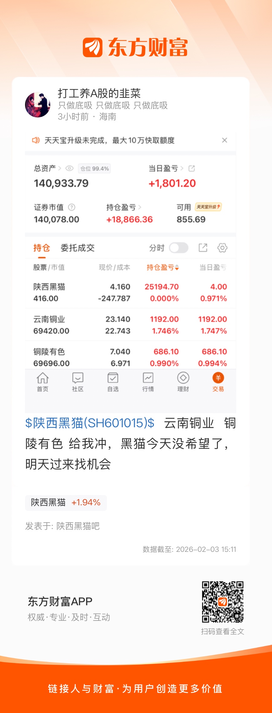 $陕西黑猫(SH601015)$  云南铜业  铜陵有色 给我冲,黑猫今天没希望了,明天过来找机会