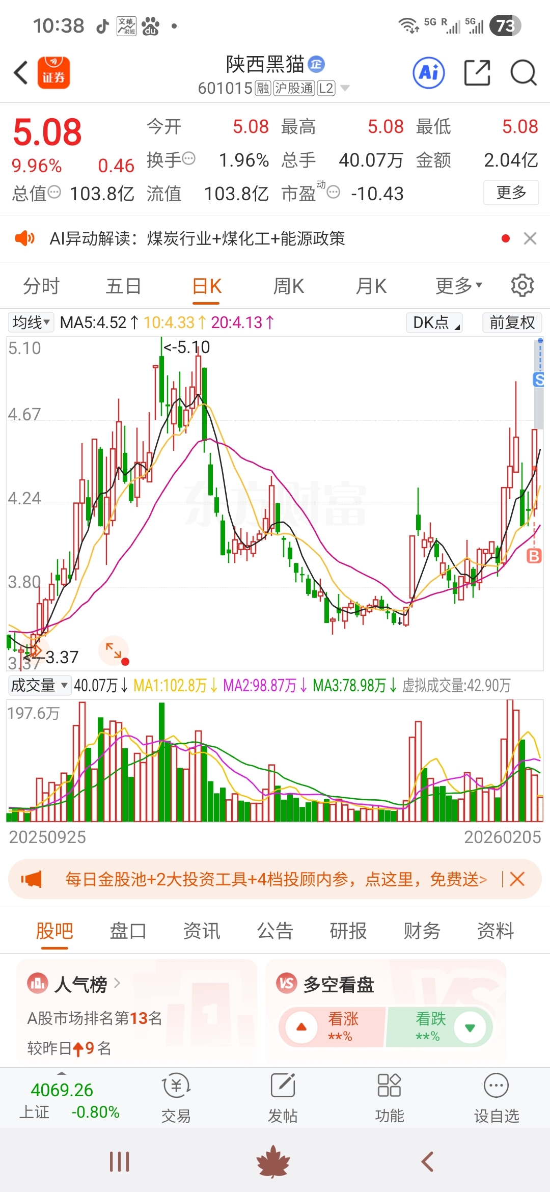$陕西黑猫(SH601015)$ 涨停也砸……板块太差