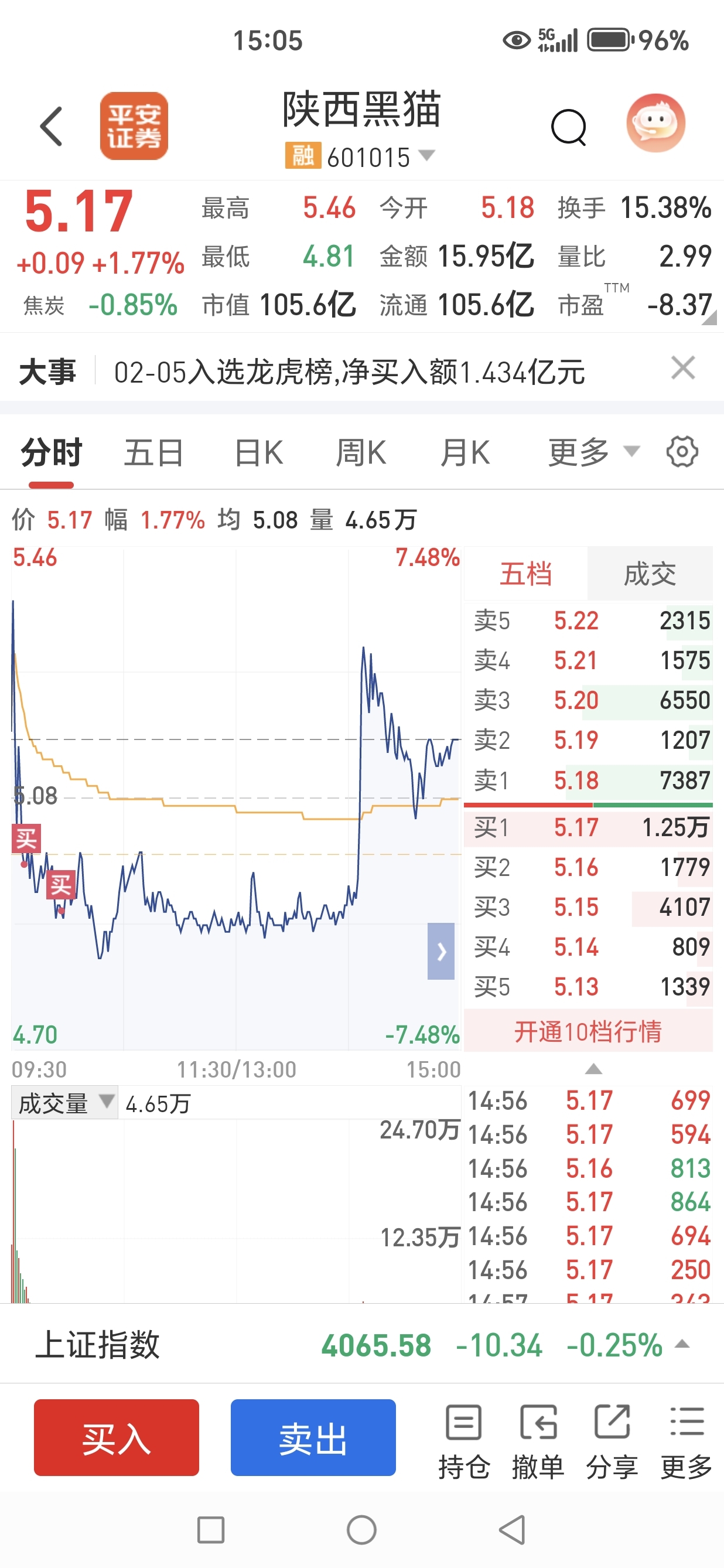 $陕西黑猫(SH601015)$ 小小可惜,没有收在5.19以上,既然符合我的二进三模式,买进。杭州解百一字涨停开盘下不了手。另外,海哥下周一不论任何价格开盘,哪怕低开,如果想卖出,一定可以在我上午分享的价格以上获利出来。