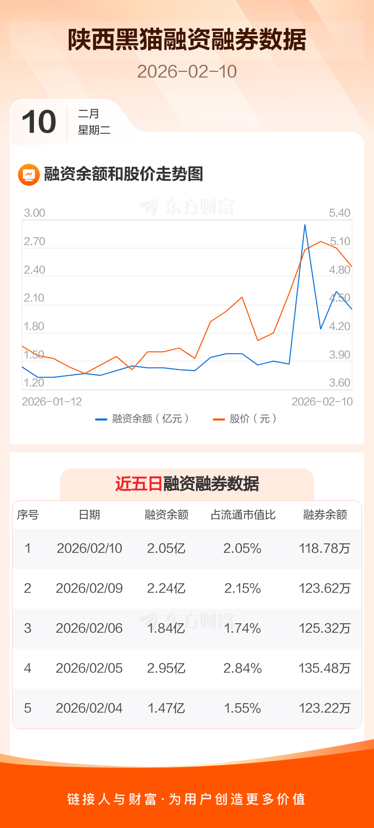 交易所最新数据显示,陕西黑猫于2026年2月10日获融资买入6943.23万元,融资偿还8770.23万元,当日融资净偿还1827万元。目前,该股融资余额2.05亿,占流通市值比例为2.05%。