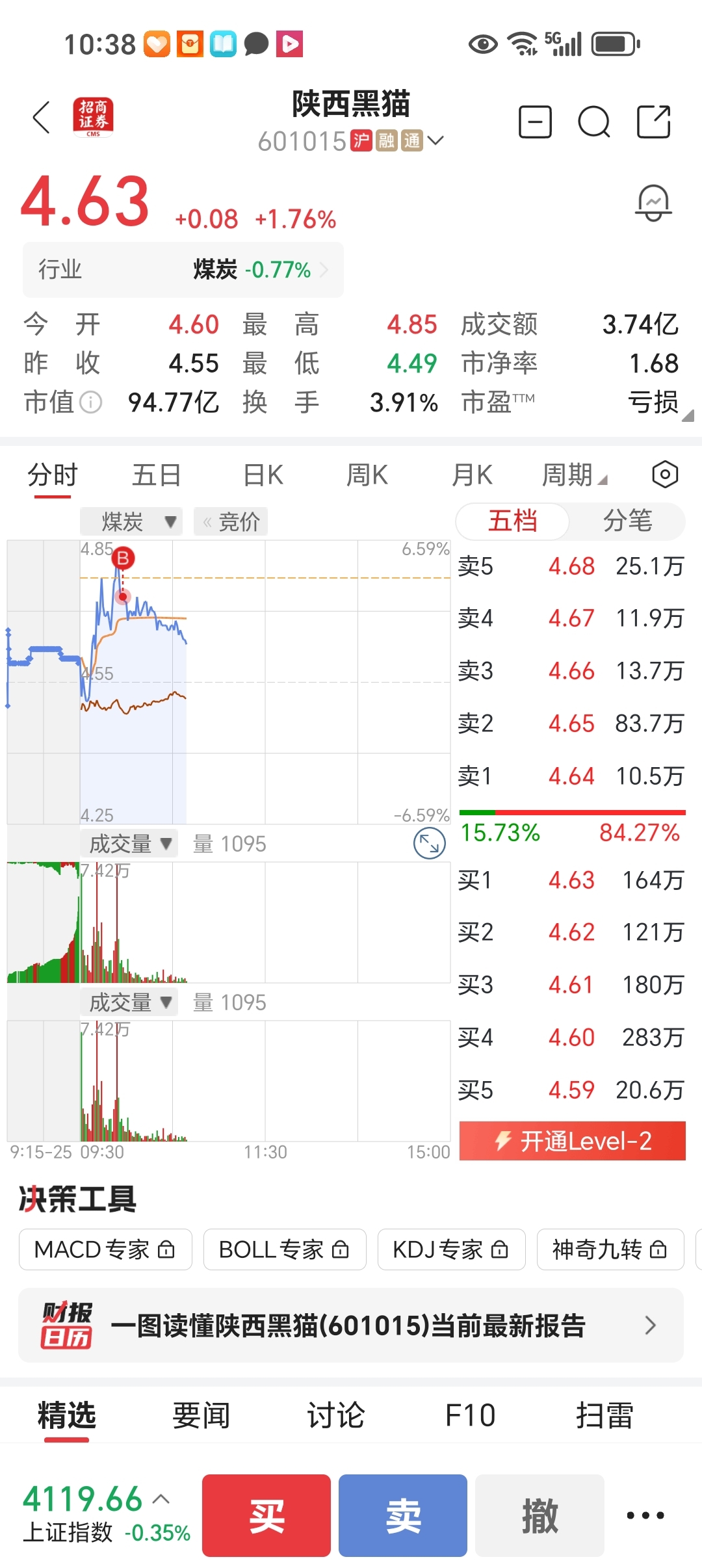 $陕西黑猫(SH601015)$ 才买了一百仓,怎就跳水了呢,嫌我买少了吗?