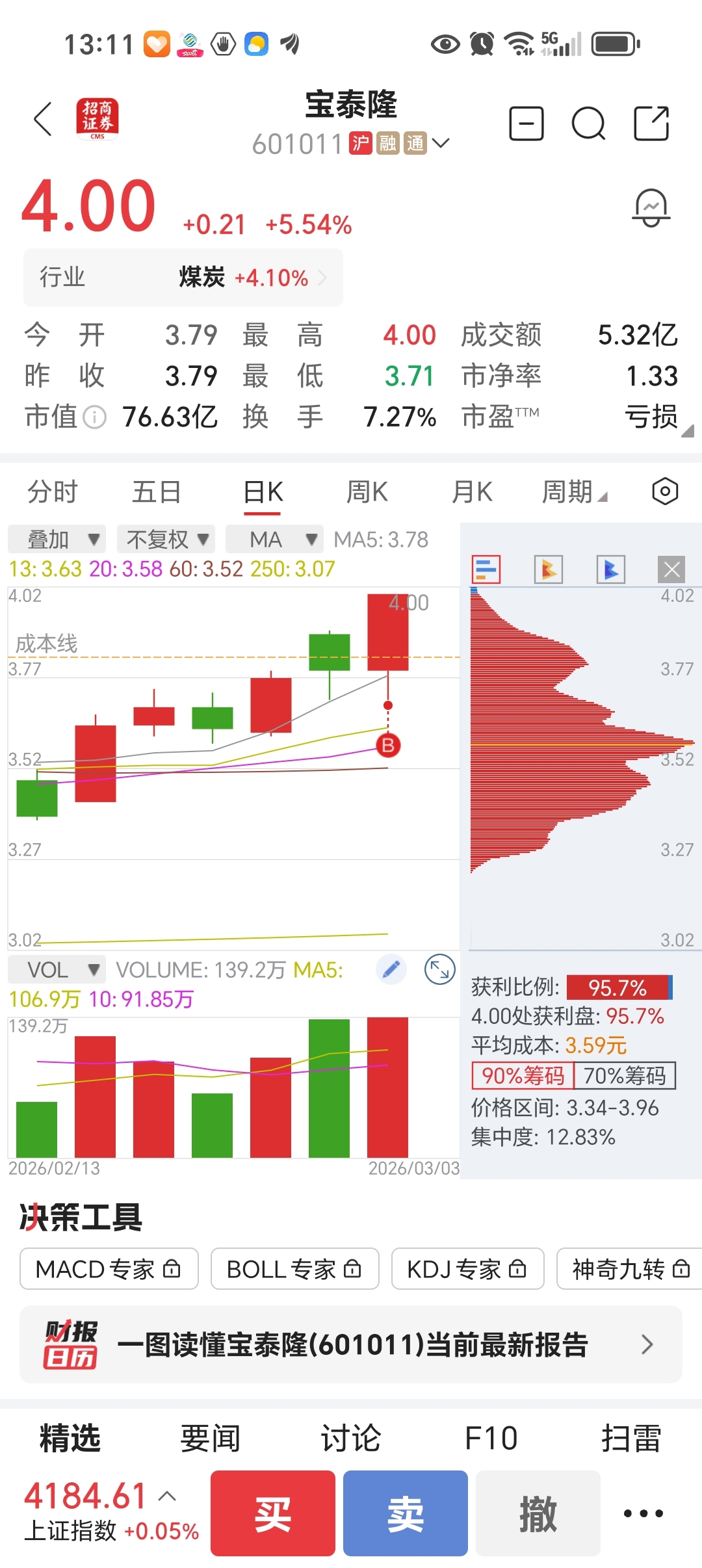 $陕西黑猫(SH601015)$ 我没跟上黑猫,就挑了这个宝泰隆,不知道能不能涨停板,好让我心里舒服一点