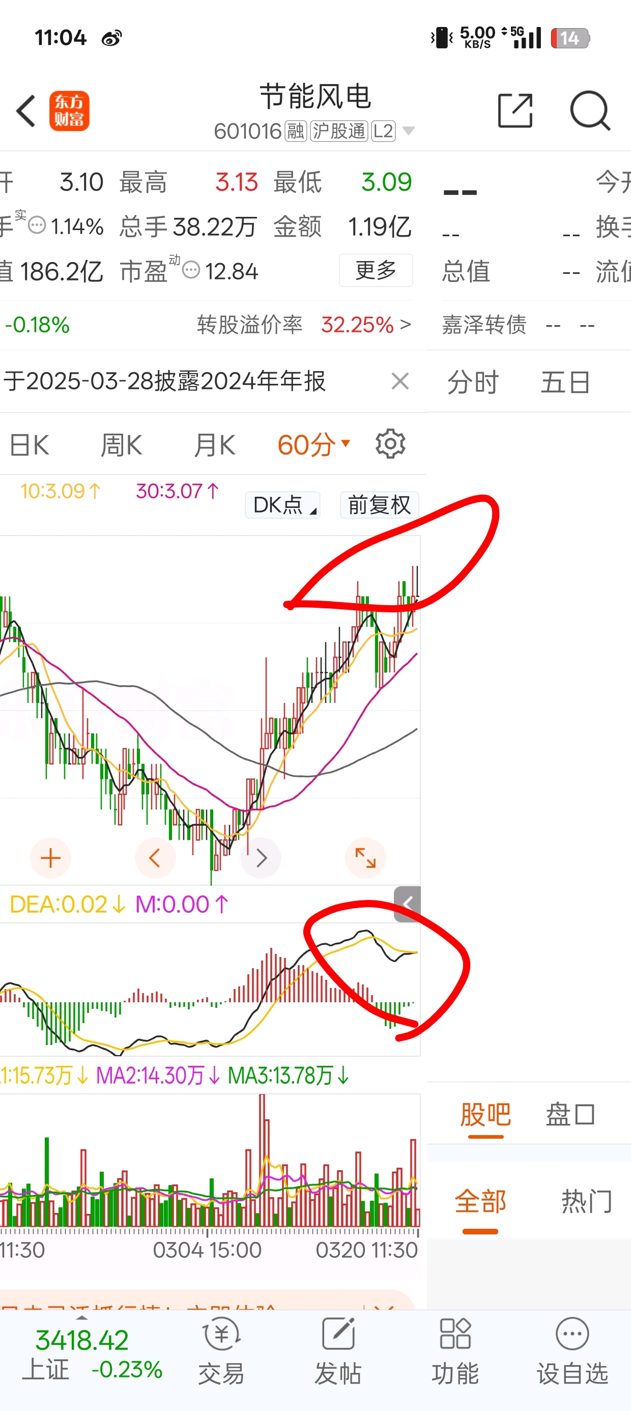 $节能风电(SH601016)$ 给你们一次技术分析,60分钟顶背离。现在是诱多过程,注意风险。