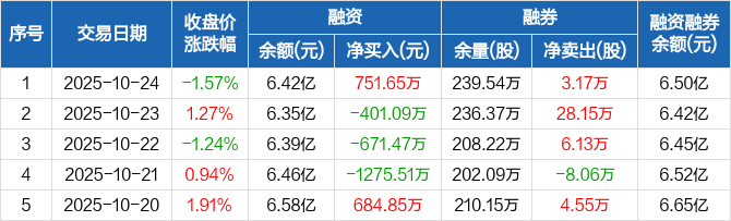 融资方面,当日融资买入3374.2万元,融资偿还2622.56万元,融资净买入751.65万元。融券方面,融券卖出5.57万股,融券偿还2.4万股,融券余量239.54万股,融券余额752.17万元。融资融券余额合计6.5亿元。