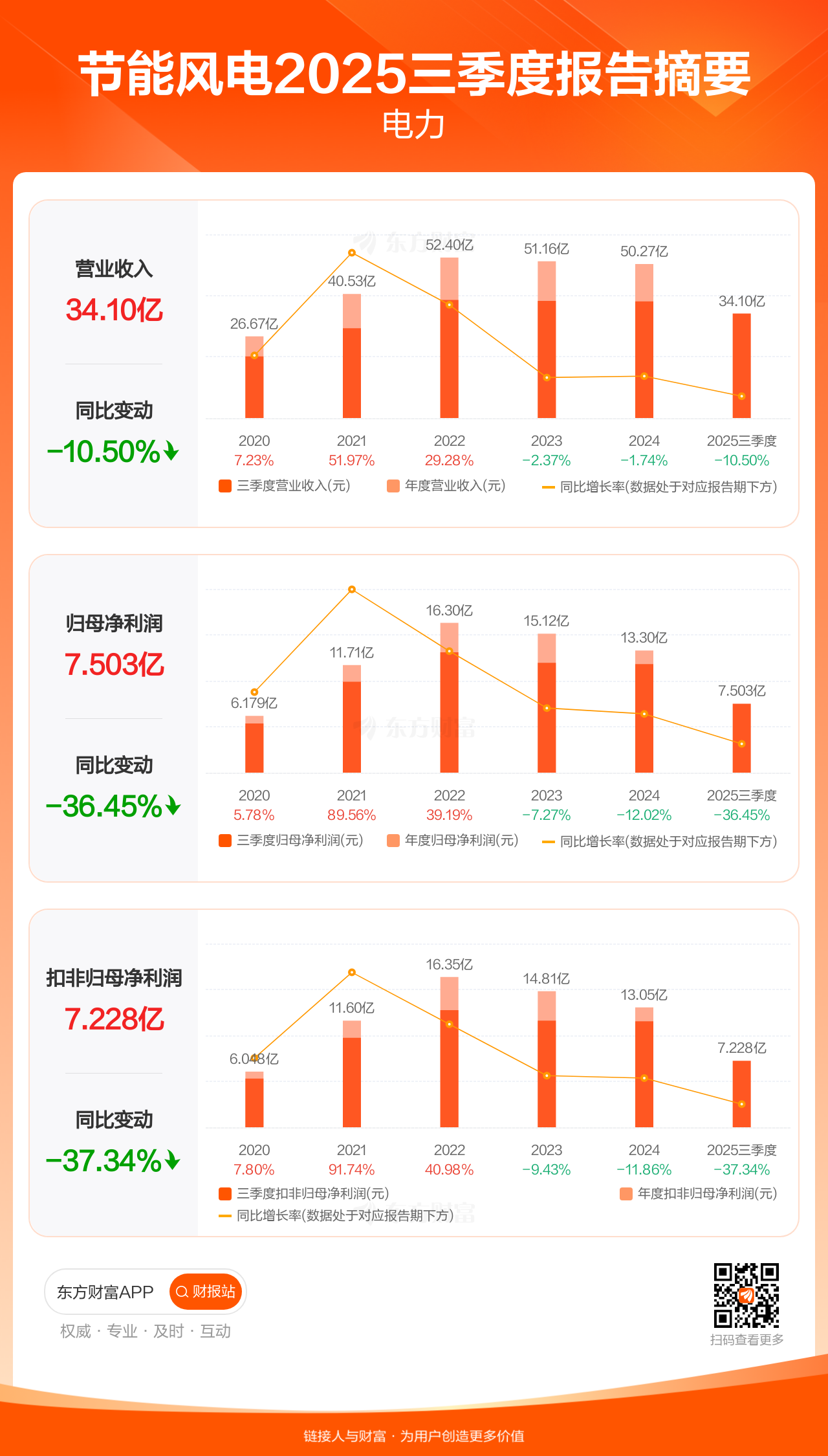 节能风电10月30日发布2025年三季报显示,公司前三季实现营业收入34.10亿元,同比下滑10.50%;归母净利润7.50亿元,同比下滑36.45%;扣非归母净利润7.23亿元,同比下滑37.34%。