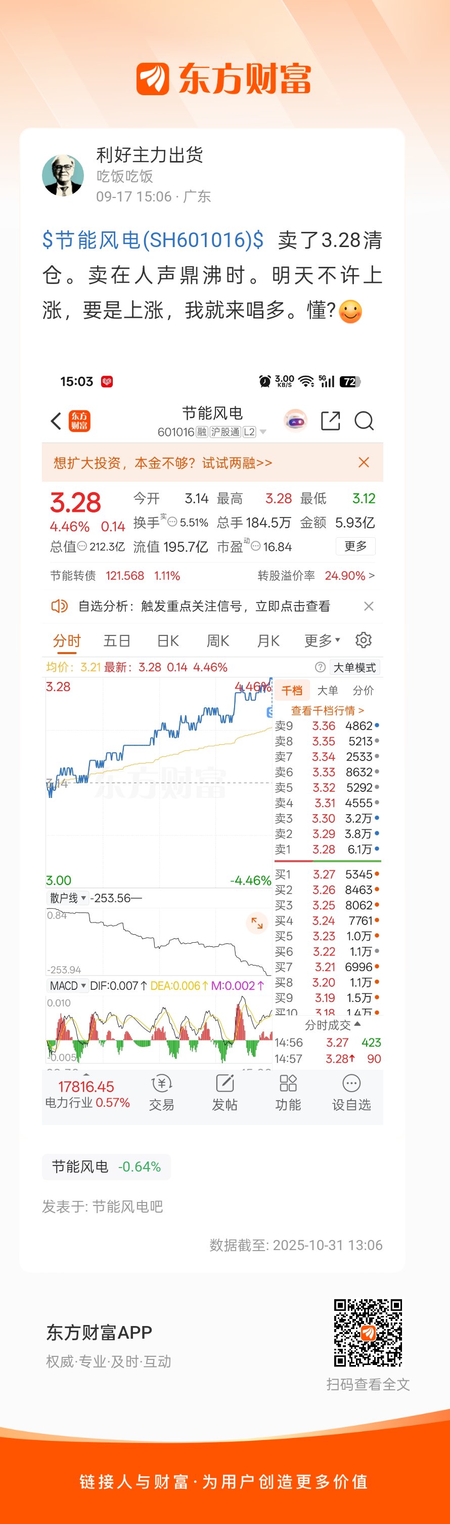 $节能风电(SH601016)$  卖了3.28清仓。卖在人声鼎沸时。明天不许上涨,要是上涨,我就来唱多。懂?