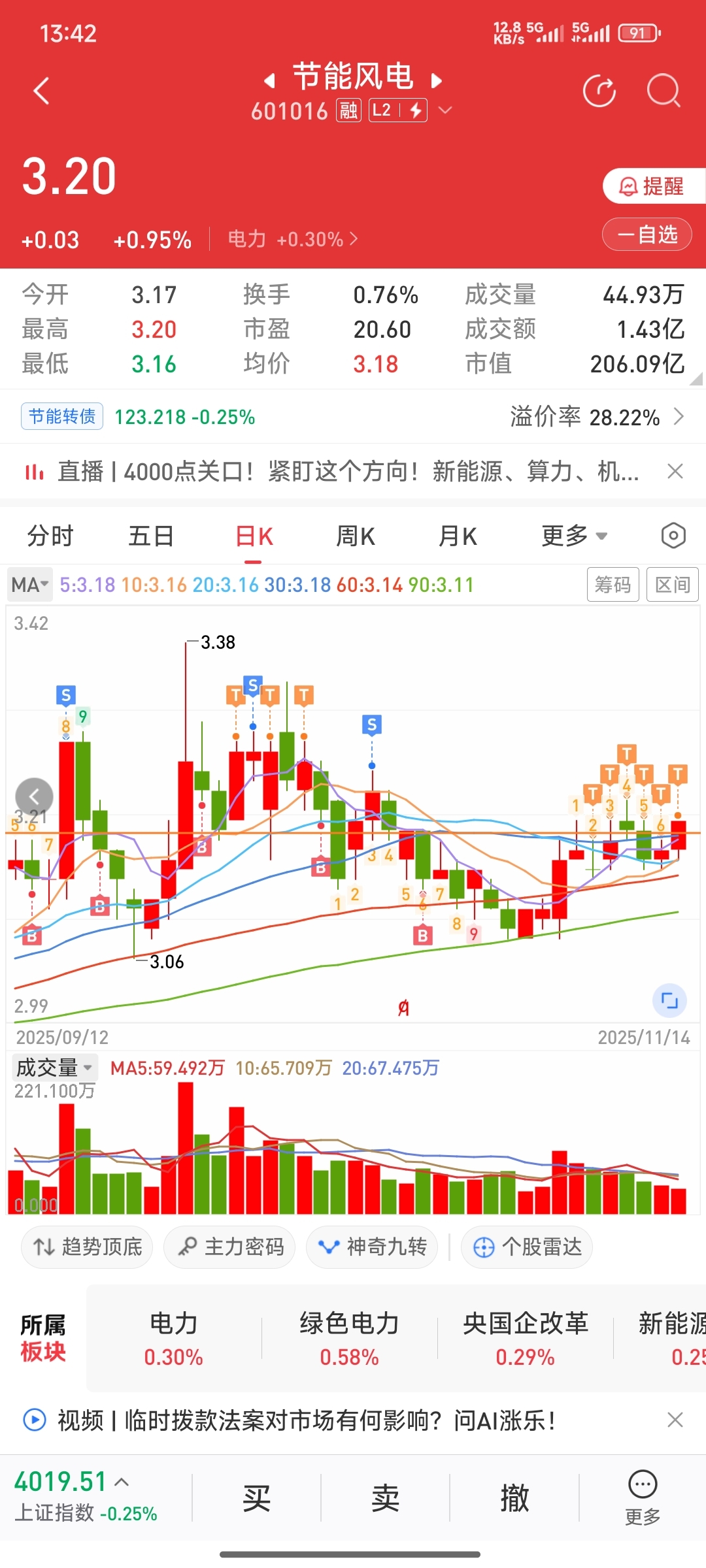 $节能风电(SH601016)$ 被套了,这个时候只能做T降成本了。