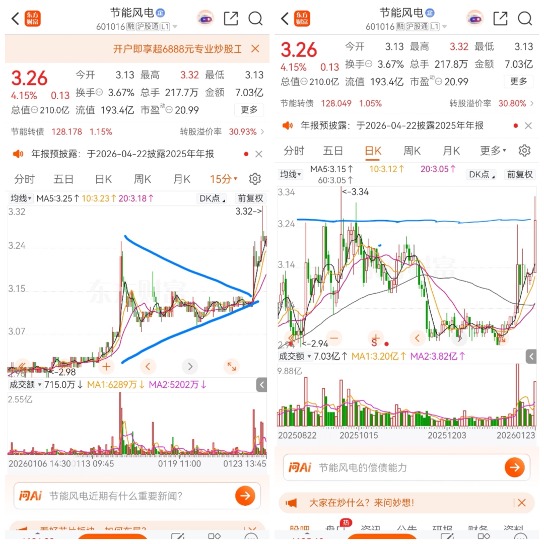 $节能风电(SH601016)$ 今天主力就干2件事:1.突破15分钟级别的收敛三角形,选择方向向上。2.夯实3.25元,这次尽可能用力的夯实,最好是照单全收的那种用力。