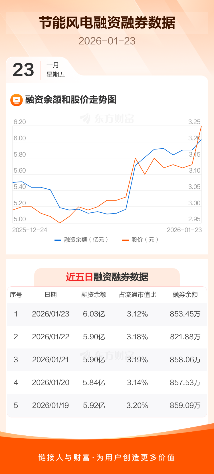 交易所最新数据显示,节能风电于2026年1月23日获融资买入7648.56万元,融资偿还6443.40万元,当日融资净买入1205.16万元。目前,该股融资余额6.03亿,占流通市值比例为3.12%。