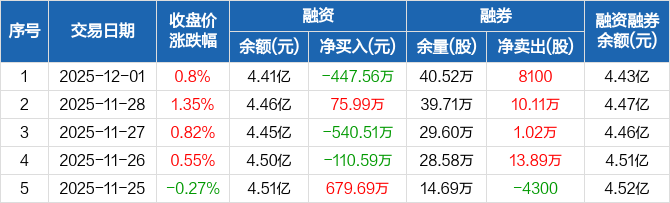 融资方面,当日融资买入4887.32万元,融资偿还5334.89万元,融资净偿还447.56万元。融券方面,融券卖出8100股,融券偿还0股,融券余量40.52万股,融券余额153.17万元。融资融券余额合计4.43亿元。