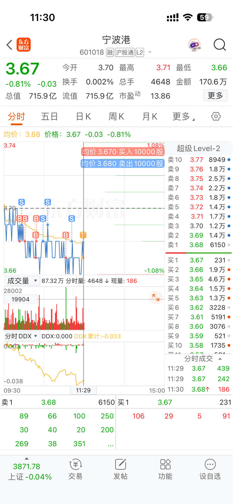 $宁波港(SH601018)$ 今天做T是真费劲!不过也T成了5笔!目前还有一笔3.66的委托买单和3.69的委托卖单没成交,3.69的卖单是因为今天手滑失误了3.68卖点成了买!不过今天主力诱空概率偏大,这个位置加仓风险也不大!!