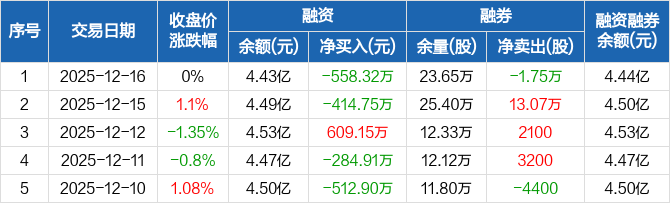 宁波港:融资净偿还558.32万元,融资余额4.43亿元(12-16)